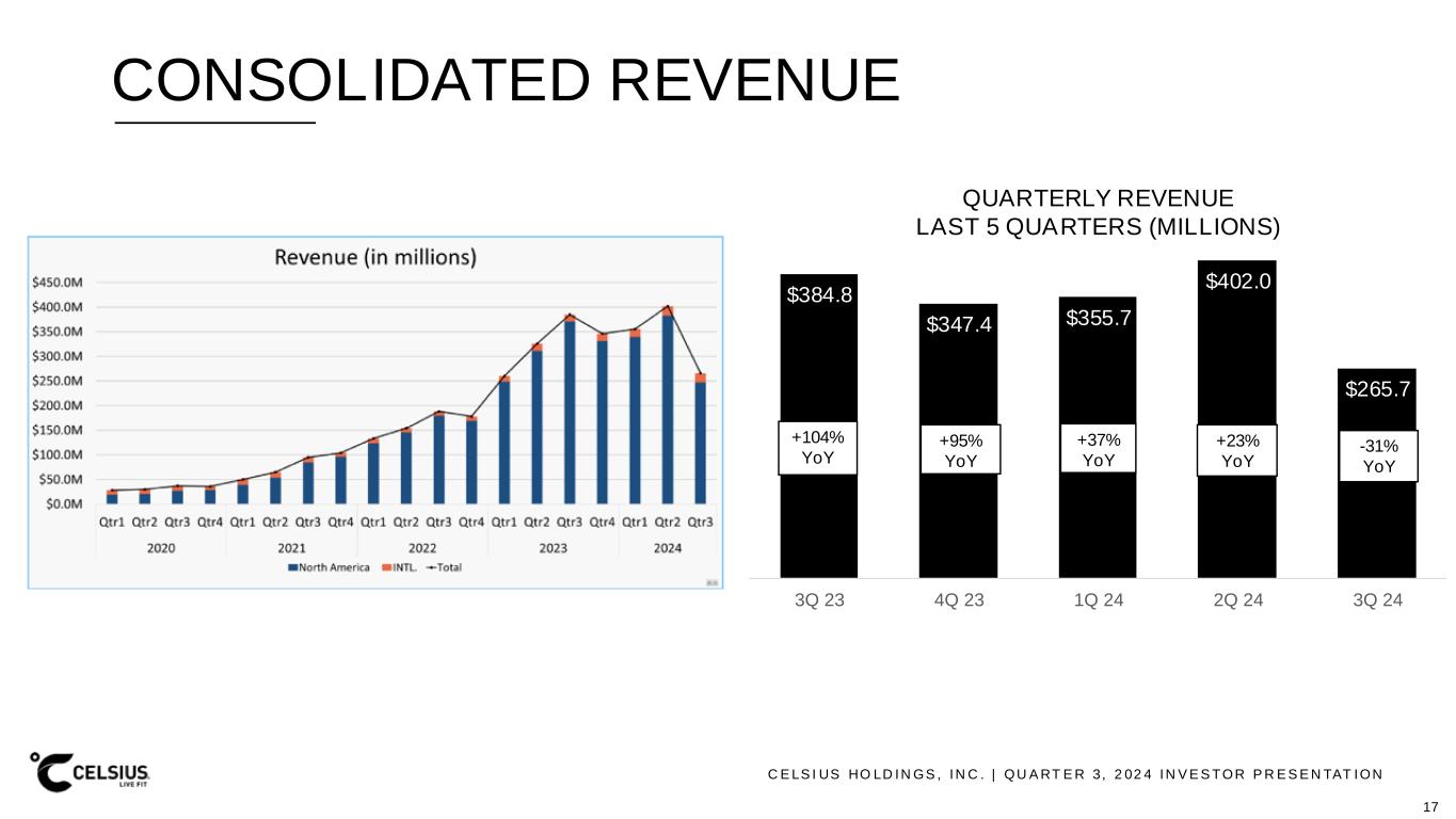 C E LS I US HO LD IN GS , IN C . | QU A RT E R 3, 2 02 4 IN V E S TOR P R E S E N TAT ION THIRD QUARTER FINANCIAL HIGHLIGHTS Summary Financials (Millions except for percentages & EPS) 3Q 2024 3Q 2023 Change YTD 2024 YTD 2023 Change Revenue $265.7 $384.8 (31)% $1,023.4 $970.6 5% N. America $247.1 $371.2 (33)% $969.0 $930.5 4% International $18.6 $13.6 37% $54.4 $40.1 36% Gross Margin 46.0% 50.4% -440 BPS 50.2% 48.1% +210 BPS Net Income $6.4 $83.9 (92)% $164.0 $176.7 (7)% Net Income att. to Common Shareholders $(0.6) $70.4 (101)% $131.0 $142.6 (8)% Diluted EPS $(0.00) $0.30 (100)% $0.55 $0.60 (8)% Adjusted EBITDA $4.4 $103.6 (96)% $192.8 $230.4 (16)% 16