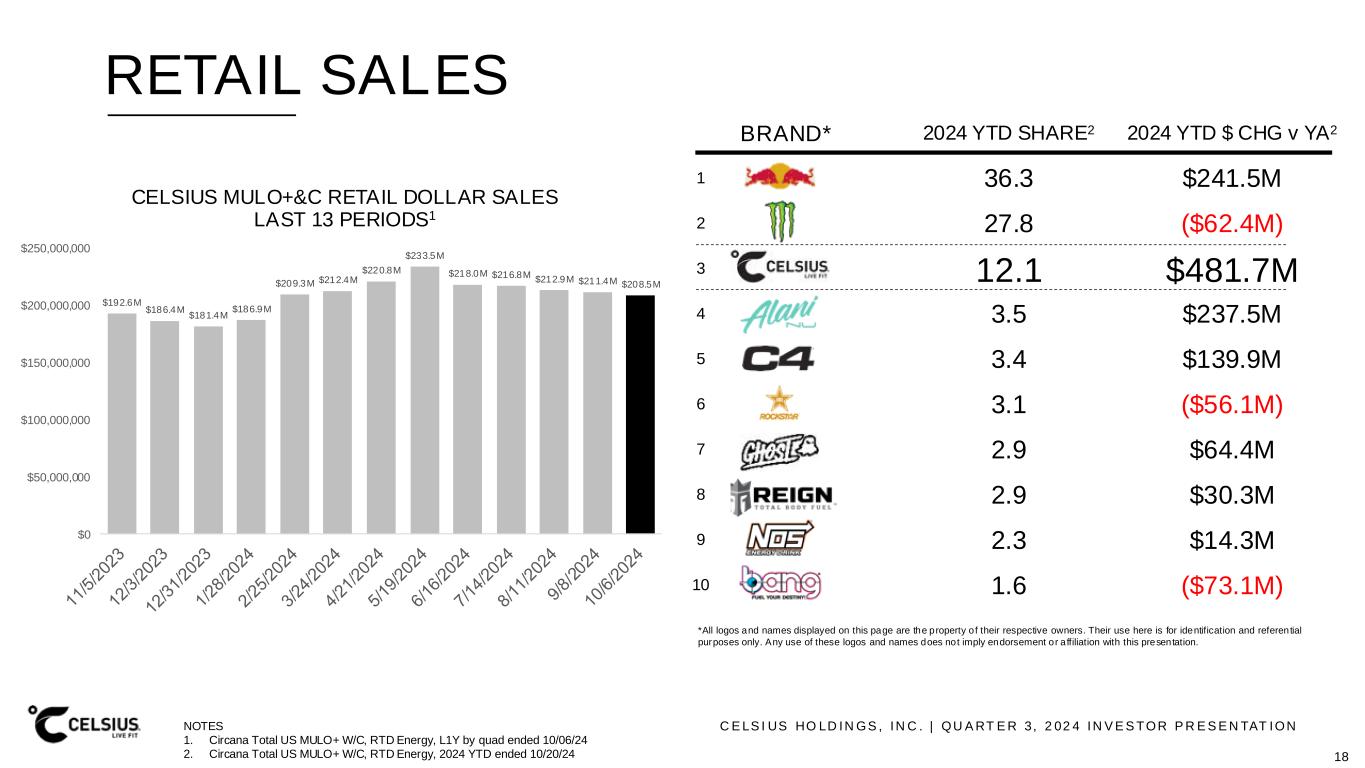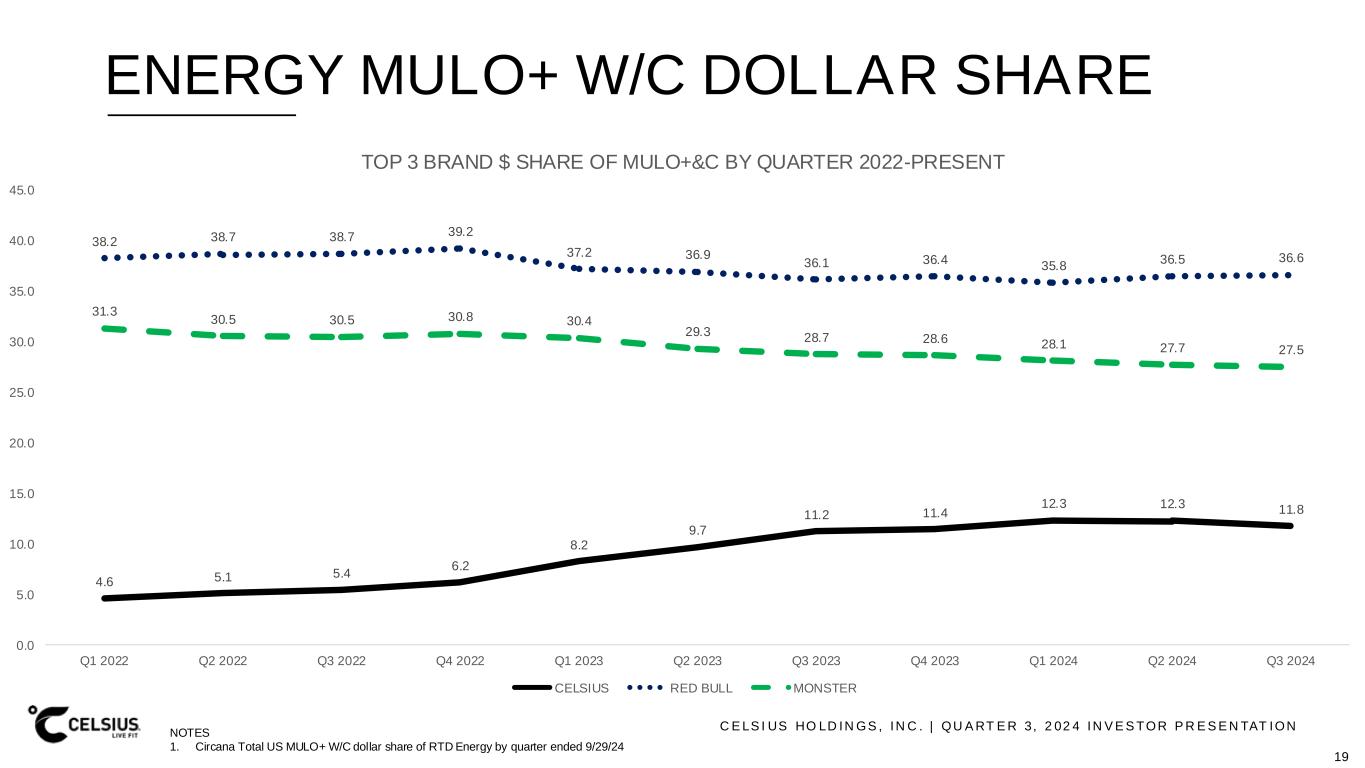 C E LS I US HO LD IN GS , IN C . | QU A RT E R 3, 2 02 4 IN V E S TOR P R E S E N TAT ION RETAIL SALES $192.6M $186.4M $181.4M $186.9M $209.3M $212.4M $220.8M $233.5M $218.0M $216.8M $212.9M $211.4M $208.5M $0 $50,000,000 $100,000,000 $150,000,000 $200,000,000 $250,000,000 CELSIUS MULO+&C RETAIL DOLLAR SALES LAST 13 PERIODS1 BRAND* 2024 YTD SHARE2 2024 YTD $ CHG v YA2 36.3 $241.5M 27.8 ($62.4M) 12.1 $481.7M 3.5 $237.5M 3.4 $139.9M 3.1 ($56.1M) 2.9 $64.4M 2.9 $30.3M 2.3 $14.3M 1.6 ($73.1M) 1 2 3 4 5 6 7 8 9 10 NOTES 1. Circana Total US MULO+ W/C, RTD Energy, L1Y by quad ended 10/06/24 2. Circana Total US MULO+ W/C, RTD Energy, 2024 YTD ended 10/20/24 *All logos and names displayed on this page are the property o f their respective owners. Their use here is for identification and referential purposes only. Any use of these logos and names does not imply endorsement or affiliation with this presentation. 18
