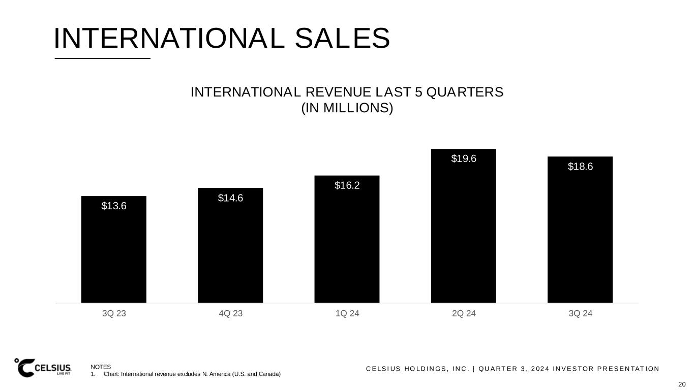 C E LS I US HO LD IN GS , IN C . | QU A RT E R 3, 2 02 4 IN V E S TOR P R E S E N TAT ION INTERNATIONAL SALES $13.6 $14.6 $16.2 $19.6 $18.6 3Q 23 4Q 23 1Q 24 2Q 24 3Q 24 INTERNATIONAL REVENUE LAST 5 QUARTERS (IN MILLIONS) NOTES 1. Chart: International revenue excludes N. America (U.S. and Canada) 20