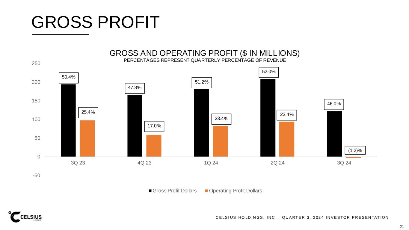 C E LS I US HO LD IN GS , IN C . | QU A RT E R 3, 2 02 4 IN V E S TOR P R E S E N TAT ION GROSS PROFIT -50 0 50 100 150 200 250 3Q 23 4Q 23 1Q 24 2Q 24 3Q 24 GROSS AND OPERATING PROFIT ($ IN MILLIONS) PERCENTAGES REPRESENT QUARTERLY PERCENTAGE OF REVENUE Gross Profit Dollars Operating Profit Dollars 52.0% 50.4% 23.4% 25.4% 23.4% 46.0% (1.2)% 47.8% 17.0% 51.2% 21