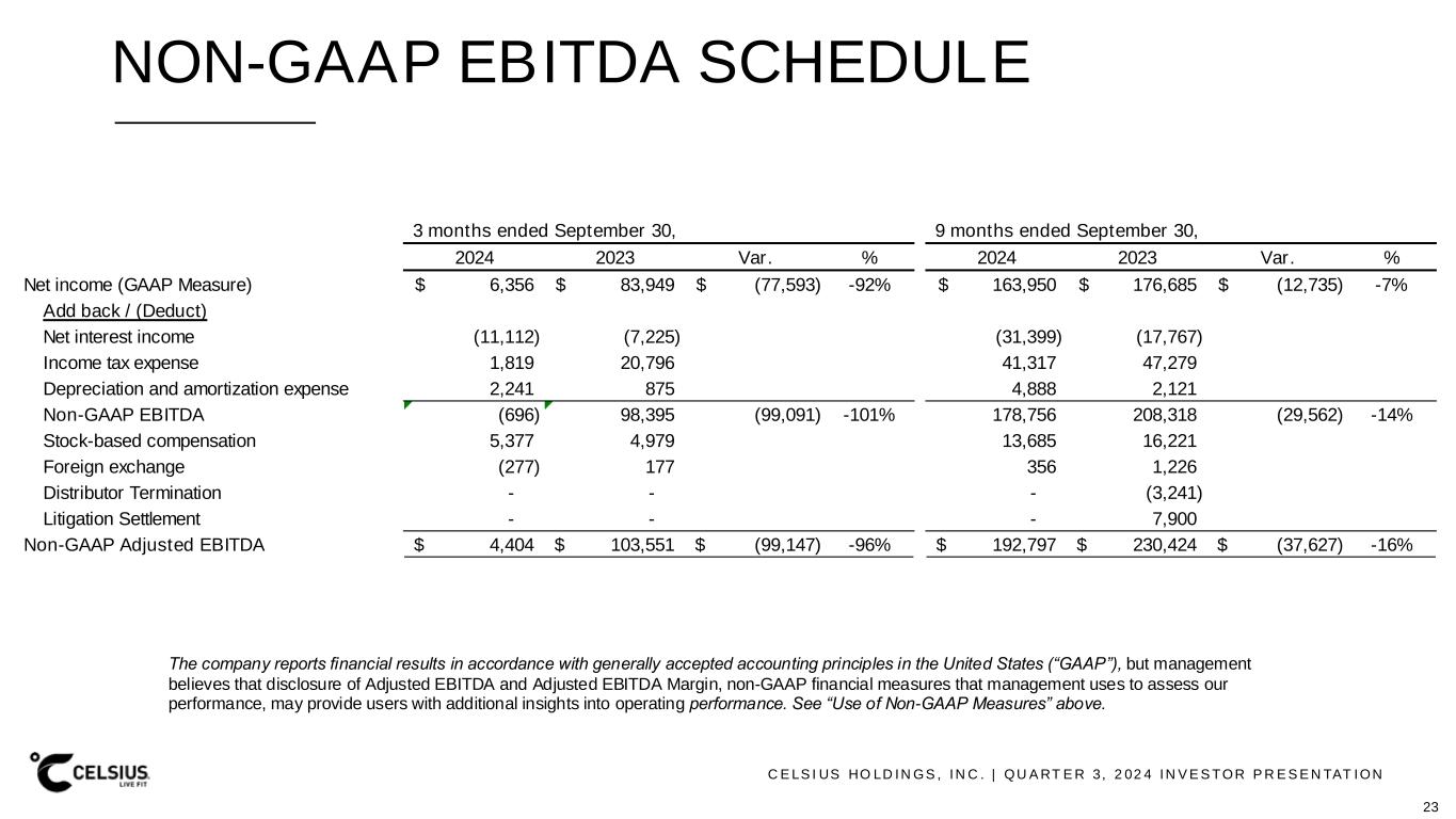 C E LS I US HO LD IN GS , IN C . | QU A RT E R 3, 2 02 4 IN V E S TOR P R E S E N TAT ION NON-GAAP EBITDA SCHEDULE The company reports financial results in accordance with generally accepted accounting principles in the United States (“GAAP”), but management believes that disclosure of Adjusted EBITDA and Adjusted EBITDA Margin, non-GAAP financial measures that management uses to assess our performance, may provide users with additional insights into operating performance. See “Use of Non-GAAP Measures” above. 23 2024 2023 Var. % 2024 2023 Var. % Net income (GAAP Measure) 6,356$ 83,949$ (77,593)$ -92% 163,950$ 176,685$ (12,735)$ -7% Add back / (Deduct) Net interest income (11,112) (7,225) (31,399) (17,767) Income tax expense 1,819 20,796 41,317 47,279 Depreciation and amortization expense 2,241 875 4,888 2,121 Non-GAAP EBITDA (696) 98,395 (99,091) -101% 178,756 208,318 (29,562) -14% Stock-based compensation 5,377 4,979 13,685 16,221 Foreign exchange (277) 177 356 1,226 Distributor Termination - - - (3,241) Litigation Settlement - - - 7,900 Non-GAAP Adjusted EBITDA 4,404$ 103,551$ (99,147)$ -96% 192,797$ 230,424$ (37,627)$ -16% 3 months ended September 30, 9 months ended September 30,