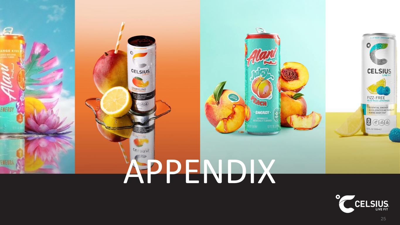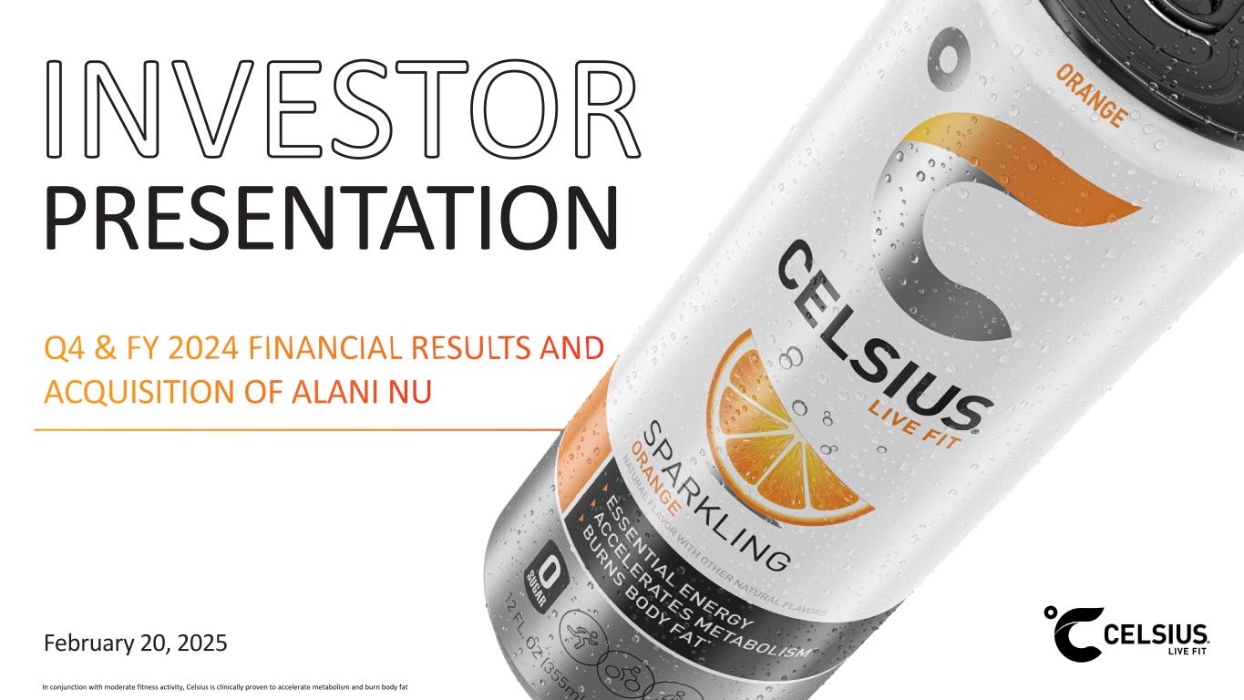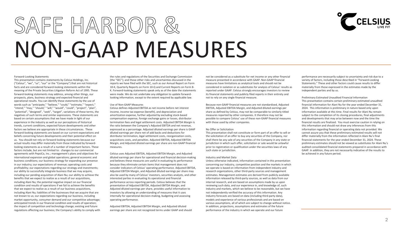 Forward-Looking Statements This presentation contains statements by Celsius Holdings, Inc. (“Celsius”, “we”, “us”, “our” or the “Company”) that are not historical facts and are considered forward-looking statements within the meaning of the Private Securities Litigation Reform Act of 1995. These forward-looking statements may address, among other things, our prospects, plans, business strategy and expected financial and operational results. You can identify these statements by the use of words such as “anticipate,” “believe,” “could,” “estimate,” “expect,” “intend,” “may,” “should,” “will,” “would”, ”could”, ”project”, ”plan”, “potential”, ”designed”, “seek”, “target”, variations of these terms, the negatives of such terms and similar expressions. These statements are based on certain assumptions that we have made in light of our experience in the industry as well as our perceptions of historical trends, current conditions, expected future developments and other factors we believe are appropriate in these circumstances. These forward-looking statements are based on our current expectations and beliefs concerning future developments and their potential effect on us. You should not rely on forward-looking statements because our actual results may differ materially from those indicated by forward- looking statements as a result of a number of important factors. These factors include, but are not limited to: changes to our commercial agreements with PepsiCo, Inc.; management’s plans and objectives for international expansion and global operations; general economic and business conditions; our business strategy for expanding our presence in our industry; our expectations of revenue; operating costs and profitability; our expectations regarding our strategy and investments; our ability to successfully integrate business that we may acquire, including our pending acquisition of Alani Nu; our ability to achieve the benefits that we expect to realize as a result of our acquisitions, including Alani Nu; the potential negative impact on our financial condition and results of operations if we fail to achieve the benefits that we expect to realize as a result of our business acquisitions, including Alani Nu; liabilities of the businesses that we acquire that are not known to us; our expectations regarding our business, including market opportunity, consumer demand and our competitive advantage; anticipated trends in our financial condition and results of operation; the impact of competition and technology change; existing and future regulations affecting our business; the Company’s ability to comply with the rules and regulations of the Securities and Exchange Commission (the “SEC”); and those other risks and uncertainties discussed in the reports we have filed with the SEC, such as our Annual Report on Form 10-K, Quarterly Reports on Form 10-Q and Current Reports on Form 8- K. Forward-looking statements speak only as of the date the statements were made. We do not undertake any obligation to update forward- looking information, except to the extent required by applicable law. Use of Non-GAAP Measures Celsius defines Adjusted EBITDA as net income before net interest income, income tax expense (benefit), and depreciation and amortization expense, further adjusted by excluding stock-based compensation expense, foreign exchange gains or losses, distributor termination fees and legal settlement costs. Adjusted EBITDA Margin is the ratio between the Company’s Adjusted EBITDA and net revenue, expressed as a percentage. Adjusted diluted earnings per share is GAAP diluted earnings per share net of add backs and deductions for distributor termination, legal settlement costs, reorganization costs, acquisitions costs, and penalties. Adjusted EBITDA, Adjusted EBITDA Margin, and Adjusted diluted earnings per share are non-GAAP financial measures. Celsius uses Adjusted EBITDA, Adjusted EBITDA Margin, and Adjusted diluted earnings per share for operational and financial decision-making and believes these measures are useful in evaluating its performance because they eliminate certain items that management does not consider indicators of Celsius’ operating performance. Adjusted EBITDA, Adjusted EBITDA Margin, and Adjusted diluted earnings per share may also be used by many of Celsius’ investors, securities analysts, and other interested parties in evaluating its operational and financial performance across reporting periods. Celsius believes that the presentation of Adjusted EBITDA, Adjusted EBITDA Margin, and Adjusted diluted earnings per share, provides useful information to investors by allowing an understanding of measures that it uses internally for operational decision-making, budgeting and assessing operating performance. Adjusted EBITDA, Adjusted EBITDA Margin, and Adjusted diluted earnings per share are not recognized terms under GAAP and should not be considered as a substitute for net income or any other financial measure presented in accordance with GAAP. Non-GAAP financial measures have limitations as analytical tools and should not be considered in isolation or as substitutes for analysis of Celsius’ results as reported under GAAP. Celsius strongly encourages investors to review its financial statements and publicly filed reports in their entirety and not to rely on any single financial measure. Because non-GAAP financial measures are not standardized, Adjusted EBITDA, Adjusted EBITDA Margin, and Adjusted diluted earnings per share as defined by Celsius, may not be comparable to similarly titled measures reported by other companies. It therefore may not be possible to compare Celsius’ use of these non-GAAP financial measures with those used by other companies. No Offer or Solicitation This presentation shall not constitute or form part of an offer to sell or the solicitation of an offer to buy any 