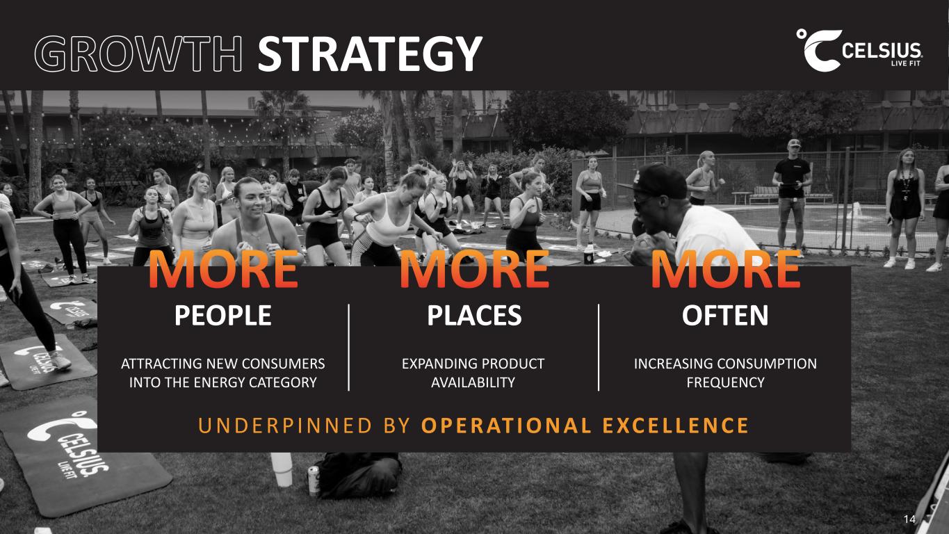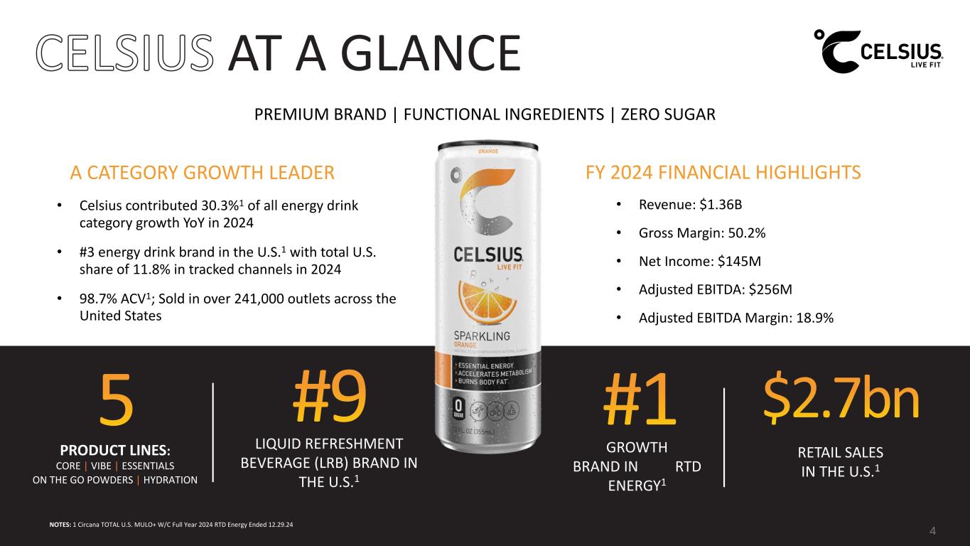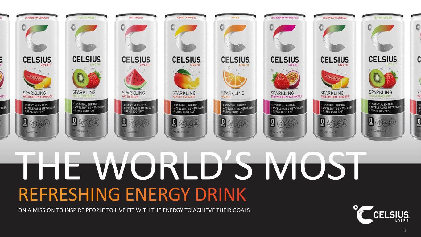 Forward-Looking Statements This presentation contains statements by Celsius Holdings, Inc. (“Celsius”, “we”, “us”, “our” or the “Company”) that are not historical facts and are considered forward-looking statements within the meaning of the Private Securities Litigation Reform Act of 1995. These forward-looking statements may address, among other things, our prospects, plans, business strategy and expected financial and operational results. You can identify these statements by the use of words such as “anticipate,” “believe,” “could,” “estimate,” “expect,” “intend,” “may,” “should,” “will,” “would”, ”could”, ”project”, ”plan”, “potential”, ”designed”, “seek”, “target”, variations of these terms, the negatives of such terms and similar expressions. These statements are based on certain assumptions that we have made in light of our experience in the industry as well as our perceptions of historical trends, current conditions, expected future developments and other factors we believe are appropriate in these circumstances. These forward-looking statements are based on our current expectations and beliefs concerning future developments and their potential effect on us. You should not rely on forward-looking statements because our actual results may differ materially from those indicated by forward- looking statements as a result of a number of important factors. These factors include, but are not limited to: changes to our commercial agreements with PepsiCo, Inc.; management’s plans and objectives for international expansion and global operations; general economic and business conditions; our business strategy for expanding our presence in our industry; our expectations of revenue; operating costs and profitability; our expectations regarding our strategy and investments; our ability to successfully integrate business that we may acquire, including our pending acquisition of Alani Nu; our ability to achieve the benefits that we expect to realize as a result of our acquisitions, including Alani Nu; the potential negative impact on our financial condition and results of operations if we fail to achieve the benefits that we expect to realize as a result of our business acquisitions, including Alani Nu; liabilities of the businesses that we acquire that are not known to us; our expectations regarding our business, including market opportunity, consumer demand and our competitive advantage; anticipated trends in our financial condition and results of operation; the impact of competition and technology change; existing and future regulations affecting our business; the Company’s ability to comply with the rules and regulations of the Securities and Exchange Commission (the “SEC”); and those other risks and uncertainties discussed in the reports we have filed with the SEC, such as our Annual Report on Form 10-K, Quarterly Reports on Form 10-Q and Current Reports on Form 8- K. Forward-looking statements speak only as of the date the statements were made. We do not undertake any obligation to update forward- looking information, except to the extent required by applicable law. Use of Non-GAAP Measures Celsius defines Adjusted EBITDA as net income before net interest income, income tax expense (benefit), and depreciation and amortization expense, further adjusted by excluding stock-based compensation expense, foreign exchange gains or losses, distributor termination fees and legal settlement costs. Adjusted EBITDA Margin is the ratio between the Company’s Adjusted EBITDA and net revenue, expressed as a percentage. Adjusted diluted earnings per share is GAAP diluted earnings per share net of add backs and deductions for distributor termination, legal settlement costs, reorganization costs, acquisitions costs, and penalties. Adjusted EBITDA, Adjusted EBITDA Margin, and Adjusted diluted earnings per share are non-GAAP financial measures. Celsius uses Adjusted EBITDA, Adjusted EBITDA Margin, and Adjusted diluted earnings per share for operational and financial decision-making and believes these measures are useful in evaluating its performance because they eliminate certain items that management does not consider indicators of Celsius’ operating performance. Adjusted EBITDA, Adjusted EBITDA Margin, and Adjusted diluted earnings per share may also be used by many of Celsius’ investors, securities analysts, and other interested parties in evaluating its operational and financial performance across reporting periods. Celsius believes that the presentation of Adjusted EBITDA, Adjusted EBITDA Margin, and Adjusted diluted earnings per share, provides useful information to investors by allowing an understanding of measures that it uses internally for operational decision-making, budgeting and assessing operating performance. Adjusted EBITDA, Adjusted EBITDA Margin, and Adjusted diluted earnings per share are not recognized terms under GAAP and should not be considered as a substitute for net income or any other financial measure presented in accordance with GAAP. Non-GAAP financial measures have limitations as analytical tools and should not be considered in isolation or as substitutes for analysis of Celsius’ results as reported under GAAP. Celsius strongly encourages investors to review its financial statements and publicly filed reports in their entirety and not to rely on any single financial measure. Because non-GAAP financial measures are not standardized, Adjusted EBITDA, Adjusted EBITDA Margin, and Adjusted diluted earnings per share as defined by Celsius, may not be comparable to similarly titled measures reported by other companies. It therefore may not be possible to compare Celsius’ use of these non-GAAP financial measures with those used by other companies. No Offer or Solicitation This presentation shall not constitute or form part of an offer to sell or the solicitation of an offer to buy any 