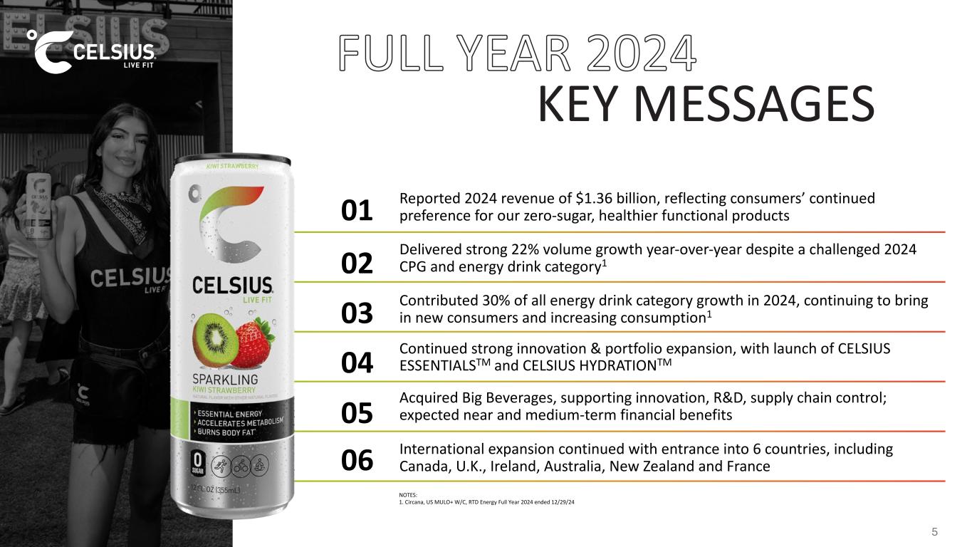AT A GLANCE PRODUCT LINES: CORE | VIBE | ESSENTIALS ON THE GO POWDERS | HYDRATION GROWTH BRAND IN RTD ENERGY1 RETAIL SALES IN THE U.S.1 FY 2024 FINANCIAL HIGHLIGHTSA CATEGORY GROWTH LEADER • Revenue: $1.36B • Gross Margin: 50.2% • Net Income: $145M • Adjusted EBITDA: $256M • Adjusted EBITDA Margin: 18.9% • Celsius contributed 30.3%1 of all energy drink category growth YoY in 2024 • #3 energy drink brand in the U.S.1 with total U.S. share of 11.8% in tracked channels in 2024 • 98.7% ACV1; Sold in over 241,000 outlets across the United States NOTES: 1 Circana TOTAL U.S. MULO+ W/C Full Year 2024 RTD Energy Ended 12.29.24 LIQUID REFRESHMENT BEVERAGE (LRB) BRAND IN THE U.S.1 PREMIUM BRAND | FUNCTIONAL INGREDIENTS | ZERO SUGAR 4