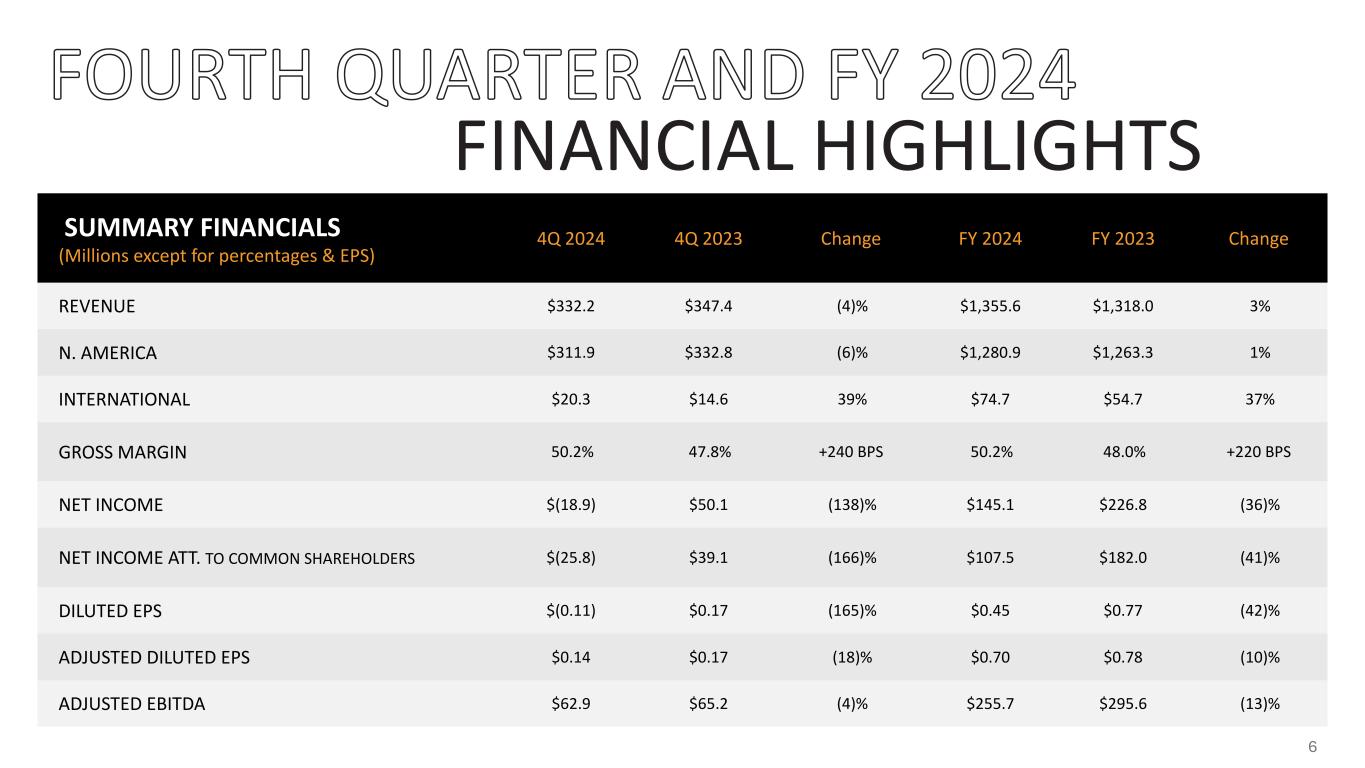SUMMARY FINANCIALS (Millions except for percentages & EPS) 4Q 2024 4Q 2023 Change FY 2024 FY 2023 Change REVENUE $332.2 $347.4 (4)% $1,355.6 $1,318.0 3% N. AMERICA $311.9 $332.8 (6)% $1,280.9 $1,263.3 1% INTERNATIONAL $20.3 $14.6 39% $74.7 $54.7 37% GROSS MARGIN 50.2% 47.8% +240 BPS 50.2% 48.0% +220 BPS NET INCOME $(18.9) $50.1 (138)% $145.1 $226.8 (36)% NET INCOME ATT. TO COMMON SHAREHOLDERS $(25.8) $39.1 (166)% $107.5 $182.0 (41)% DILUTED EPS $(0.11) $0.17 (165)% $0.45 $0.77 (42)% ADJUSTED DILUTED EPS $0.14 $0.17 (18)% $0.70 $0.78 (10)% ADJUSTED EBITDA $62.9 $65.2 (4)% $255.7 $295.6 (13)% FINANCIAL HIGHLIGHTS 6