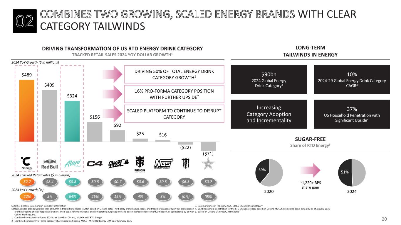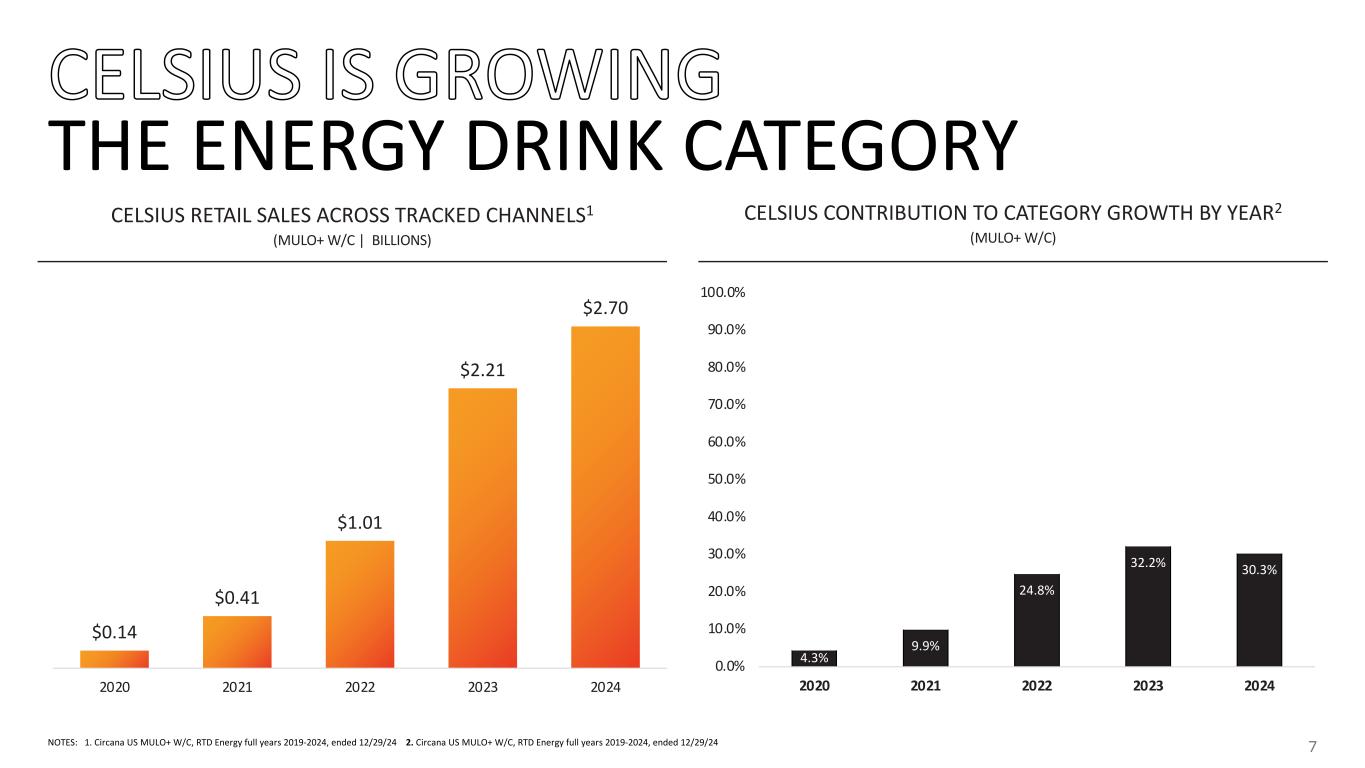 WITH CLEAR CATEGORY TAILWINDS $489 $409 $324 $156 $92 $25 $16 ($22) ($71) DRIVING TRANSFORMATION OF US RTD ENERGY DRINK CATEGORY TRACKED RETAIL SALES 2024 YOY DOLLAR GROWTH1 LONG-TERM TAILWINDS IN ENERGY $90bn 2024 Global Energy Drink Category3 10% 2024-29 Global Energy Drink Category CAGR3 Increasing Category Adoption and Incrementality 37% US Household Penetration with Significant Upside4 39% 51% SUGAR-FREE Share of RTD Energy5 ~1,220+ BPS share gain 2020 2024 SOURCE: Circana, Euromonitor, Company information NOTE: Excludes brands with less than $500mm in tracked retail sales in 2024 based on Circana data; Third-party brand names, logos, and trademarks appearing in this presentation are the property of their respective owners. Their use is for informational and comparative purposes only and does not imply endorsement, affiliation, or sponsorship by or with Celsius Holdings, Inc. 1. Combined company Pro-Forma 2024 sales based on Circana, MULO+ W/C RTD Energy 2. Combined company Pro-Forma category share based on Circana, MULO+ W/C RTD Energy LTM as of February 2025 3. Euromonitor as of February 2025, Global Energy Drink Category 4. 2024 Household penetration for the RTD Energy category based on Circana MULOC syndicated panel data LTM as of January 2025 5. Based on Circana US MULOC RTD Energy DRIVING 50% OF TOTAL ENERGY DRINK CATEGORY GROWTH1 16% PRO-FORMA CATEGORY POSITION WITH FURTHER UPSIDE2 SCALED PLATFORM TO CONTINUE TO DISRUPT CATEGORY 2024 YoY Growth (%) 2024 YoY Growth ($ in millions) 64%5%22% 25% 16% 4% 3% (9%)(0%) 2024 Tracked Retail Sales ($ in billions) $0.8$8.4$2.7 $0.8 $0.7 $0.6 $0.5 $0.7$6.3 20