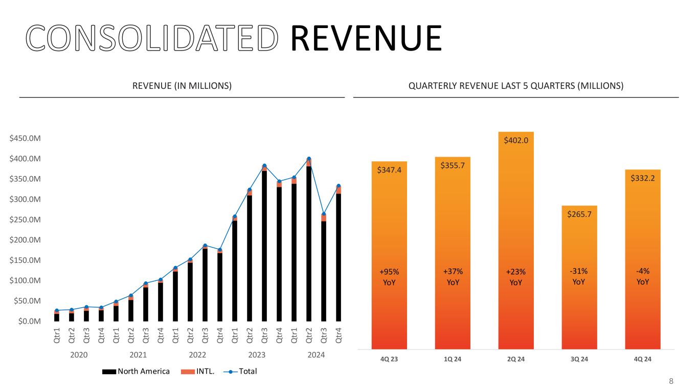 REVENUE QUARTERLY REVENUE LAST 5 QUARTERS (MILLIONS) $347.4 $355.7 $402.0 $265.7 $332.2 4Q 23 1Q 24 2Q 24 3Q 24 4Q 24 +23% YoY +95% YoY -4% YoY REVENUE (IN MILLIONS) +37% YoY -31% YoY $0.0M $50.0M $100.0M $150.0M $200.0M $250.0M $300.0M $350.0M $400.0M $450.0M Q tr 1 Q tr 2 Q tr 3 Q tr 4 Q tr 1 Q tr 2 Q tr 3 Q tr 4 Q tr 1 Q tr 2 Q tr 3 Q tr 4 Q tr 1 Q tr 2 Q tr 3 Q tr 4 Q tr 1 Q tr 2 Q tr 3 Q tr 4 2020 2021 2022 2023 2024 North America INTL. Total 8