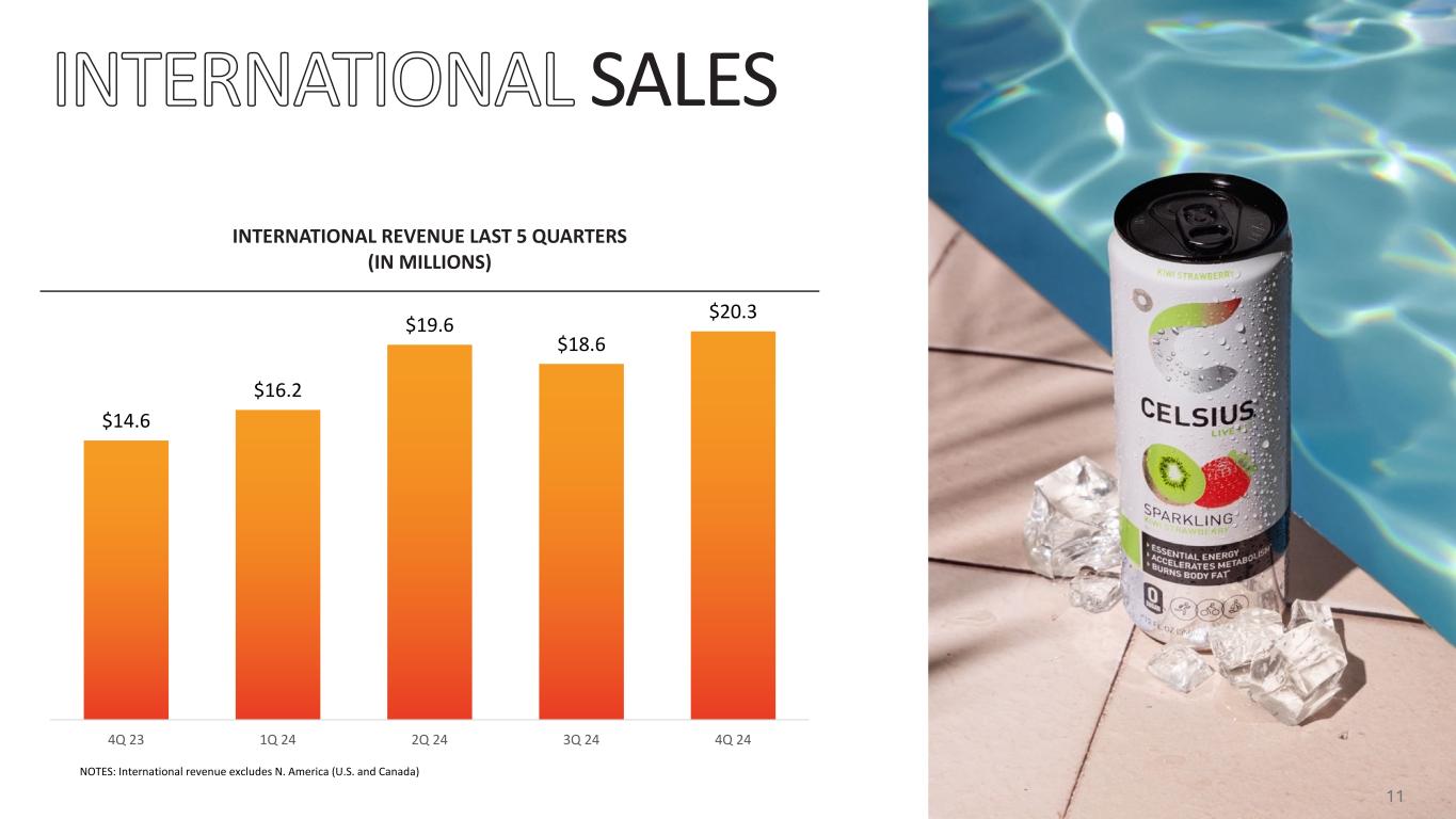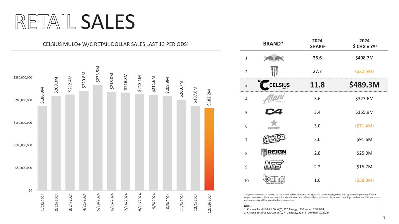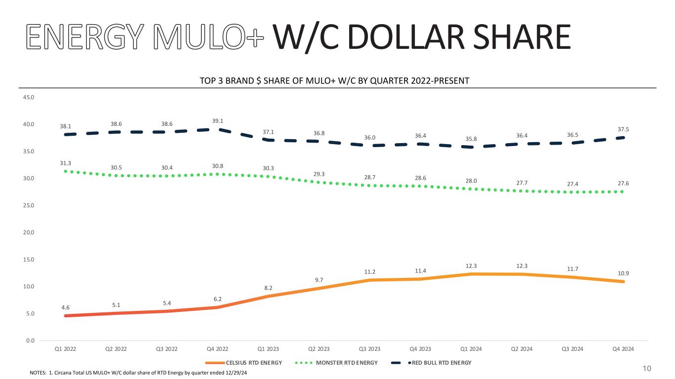 SALES $1 86 .9 M $2 09 .3 M $2 12 .4 M $2 20 .8 M $2 33 .5 M $2 18 .0 M $2 16 .8 M $2 13 .1 M $2 11 .6 M $2 08 .9 M $2 00 .7 M $1 87 .6 M $1 82 .2 M $0 $50,000,000 $100,000,000 $150,000,000 $200,000,000 $250,000,000 1/ 28 /2 02 4 2/ 25 /2 02 4 3/ 24 /2 02 4 4/ 21 /2 02 4 5/ 19 /2 02 4 6/ 16 /2 02 4 7/ 14 /2 02 4 8/ 11 /2 02 4 9/ 8/ 20 24 10 /6 /2 02 4 11 /3 /2 02 4 12 /1 /2 02 4 12 /2 9/ 20 24 BRAND* 2024 SHARE2 2024 $ CHG v YA2 1 36.6 $408.7M 2 27.7 ($22.5M) 3 11.8 $489.3M 4 3.6 $323.6M 5 3.4 $155.9M 6 3.0 ($71.4M) 7 3.0 $91.6M 8 2.8 $25.0M 9 2.2 $15.7M 10 1.6 ($58.0M) *Representative set of brands, not intended to be exhaustive. All logos and names displayed on this page are the property of their respective owners. Their use here is for identification and referential purposes only. Any use of these logos and names does not imply endorsement or affiliation with this presentation. CELSIUS MULO+ W/C RETAIL DOLLAR SALES LAST 13 PERIODS1 NOTES 1. Circana Total US MULO+ W/C, RTD Energy, L13P ended 12/29/24 2. Circana Total US MULO+ W/C, RTD Energy, 2024 YTD ended 12/29/24 9