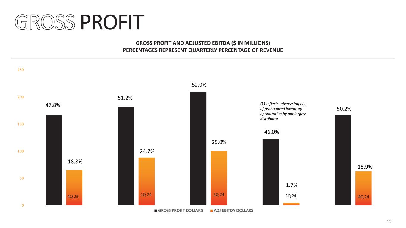 SALES $14.6 $16.2 $19.6 $18.6 $20.3 4Q 23 1Q 24 2Q 24 3Q 24 4Q 24 NOTES: International revenue excludes N. America (U.S. and Canada) INTERNATIONAL REVENUE LAST 5 QUARTERS (IN MILLIONS) 11