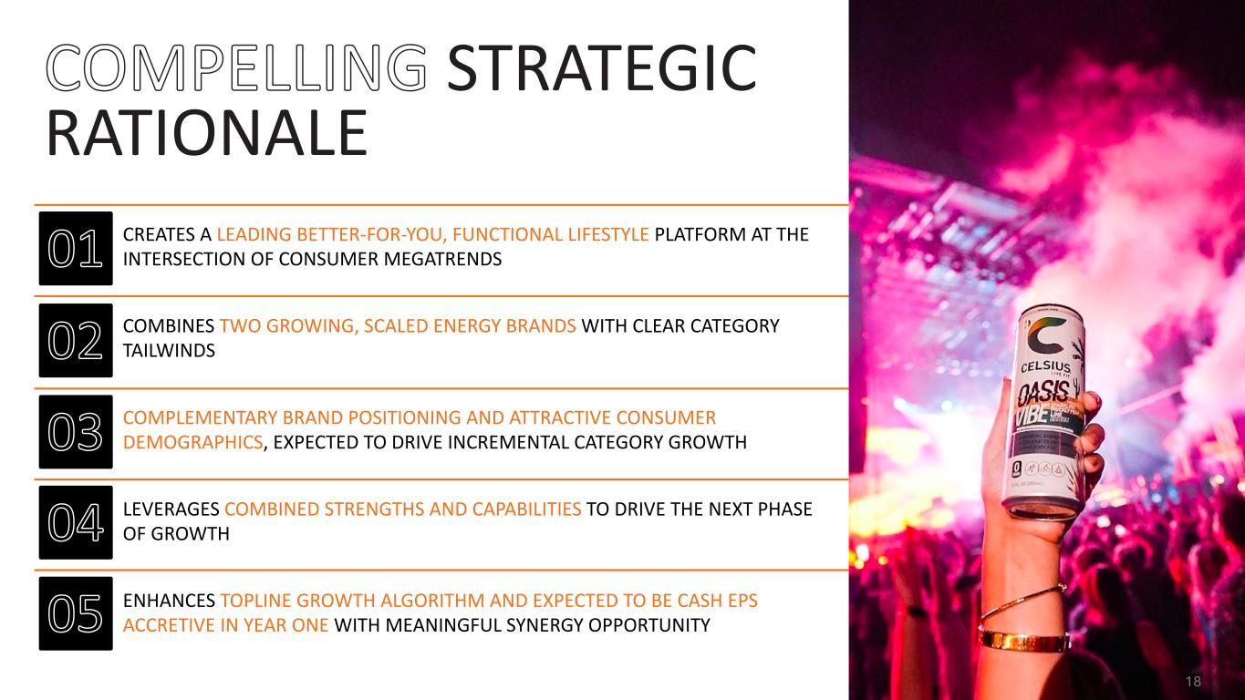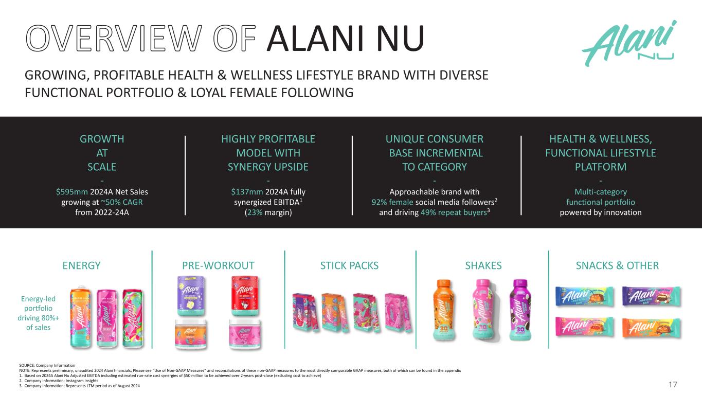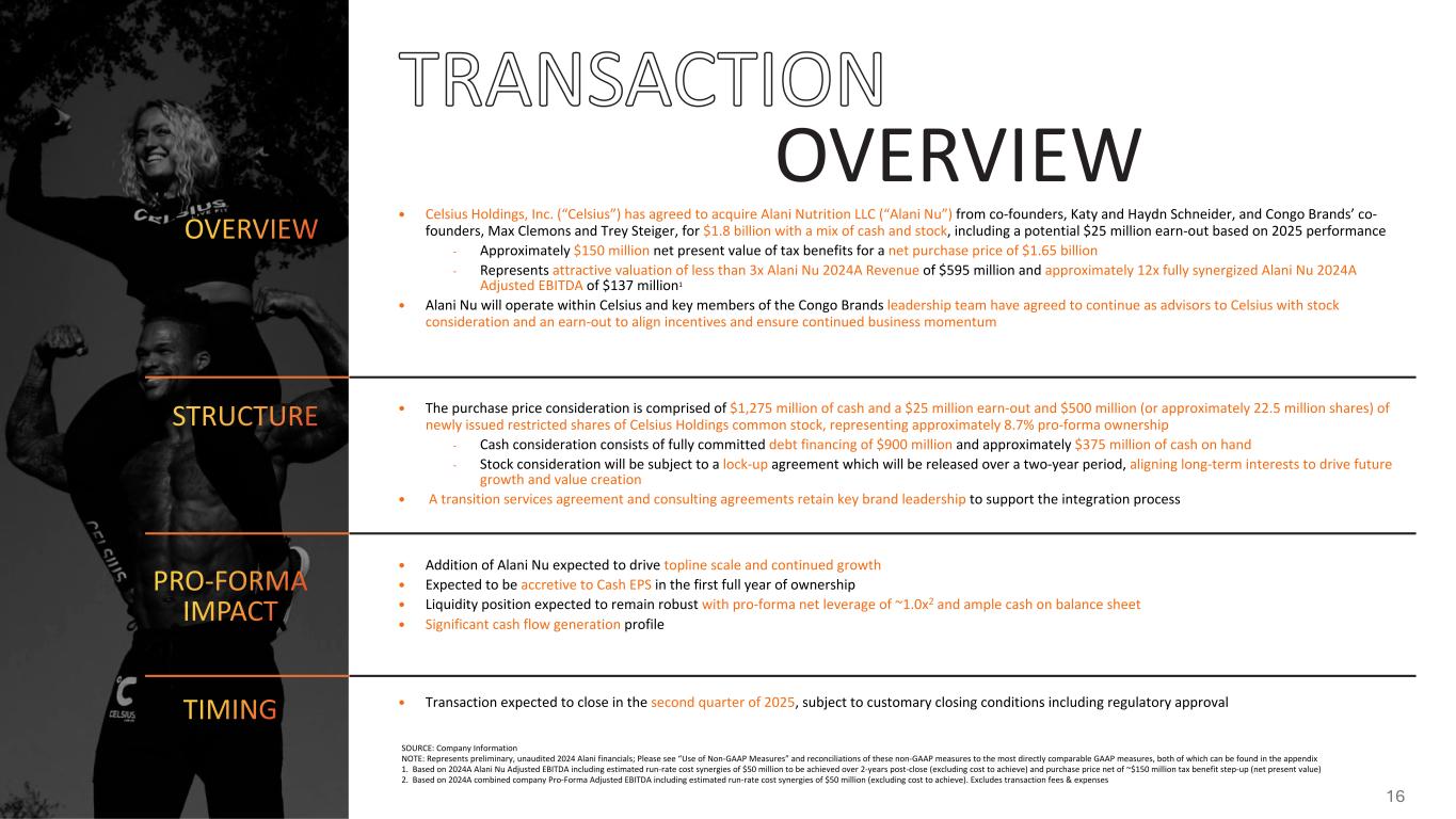OVERVIEW — Celsius Holdings, Inc. (“Celsius”) has agreed to acquire Alani Nutrition LLC (“Alani Nu”) from co-founders, Katy and Haydn Schneider, and Congo Brands’ co- founders, Max Clemons and Trey Steiger, for $1.8 billion with a mix of cash and stock, including a potential $25 million earn-out based on 2025 performance - Approximately $150 million net present value of tax benefits for a net purchase price of $1.65 billion - Represents attractive valuation of less than 3x Alani Nu 2024A Revenue of $595 million and approximately 12x fully synergized Alani Nu 2024A Adjusted EBITDA of $137 million1 — Alani Nu will operate within Celsius and key members of the Congo Brands leadership team have agreed to continue as advisors to Celsius with stock consideration and an earn-out to align incentives and ensure continued business momentum — The purchase price consideration is comprised of $1,275 million of cash and a $25 million earn-out and $500 million (or approximately 22.5 million shares) of newly issued restricted shares of Celsius Holdings common stock, representing approximately 8.7% pro-forma ownership - Cash consideration consists of fully committed debt financing of $900 million and approximately $375 million of cash on hand - Stock consideration will be subject to a lock-up agreement which will be released over a two-year period, aligning long-term interests to drive future growth and value creation — A transition services agreement and consulting agreements retain key brand leadership to support the integration process — Addition of Alani Nu expected to drive topline scale and continued growth — Expected to be accretive to Cash EPS in the first full year of ownership — Liquidity position expected to remain robust with pro-forma net leverage of ~1.0x2 and ample cash on balance sheet — Significant cash flow generation profile — Transaction expected to close in the second quarter of 2025, subject to customary closing conditions including regulatory approval SOURCE: Company Information NOTE: Represents preliminary, unaudited 2024 Alani financials; Please see “Use of Non-GAAP Measures” and reconciliations of these non-GAAP measures to the most directly comparable GAAP measures, both of which can be found in the appendix 1. Based on 2024A Alani Nu Adjusted EBITDA including estimated run-rate cost synergies of $50 million to be achieved over 2-years post-close (excluding cost to achieve) and purchase price net of ~$150 million tax benefit step-up (net present value) 2. Based on 2024A combined company Pro-Forma Adjusted EBITDA including estimated run-rate cost synergies of $50 million (excluding cost to achieve). Excludes transaction fees & expenses 16
