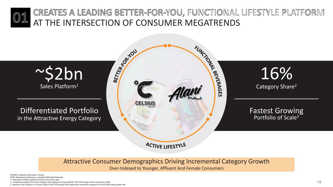 STRATEGIC RATIONALE CREATES A LEADING BETTER-FOR-YOU, FUNCTIONAL LIFESTYLE PLATFORM AT THE INTERSECTION OF CONSUMER MEGATRENDS COMBINES TWO GROWING, SCALED ENERGY BRANDS WITH CLEAR CATEGORY TAILWINDS COMPLEMENTARY BRAND POSITIONING AND ATTRACTIVE CONSUMER DEMOGRAPHICS, EXPECTED TO DRIVE INCREMENTAL CATEGORY GROWTH LEVERAGES COMBINED STRENGTHS AND CAPABILITIES TO DRIVE THE NEXT PHASE OF GROWTH ENHANCES TOPLINE GROWTH ALGORITHM AND EXPECTED TO BE CASH EPS ACCRETIVE IN YEAR ONE WITH MEANINGFUL SYNERGY OPPORTUNITY 18
