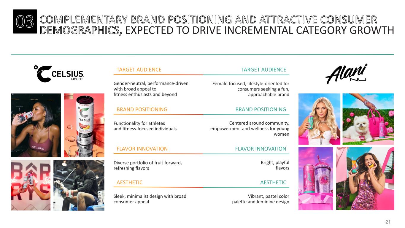 AT THE INTERSECTION OF CONSUMER MEGATRENDS SOURCE: Company information, Circana NOTE: Represents preliminary, unaudited 2024 Alani financials 1. Represents 2024A combined company Pro-Forma sales 2. Combined company Pro-Forma category share based on Circana, MULO+ W/C RTD Energy LTM as of February 2025 3. Based on Top 10 players in Circana, MULO+ W/C RTD Energy 2024; Represents combined company Pro-Forma 2024 sales growth rate Attractive Consumer Demographics Driving Incremental Category Growth Over-Indexed to Younger, Affluent And Female Consumers ~$2bn Sales Platform1 16% Category Share2 Differentiated Portfolio in the Attractive Energy Category Fastest Growing Portfolio of Scale3 19