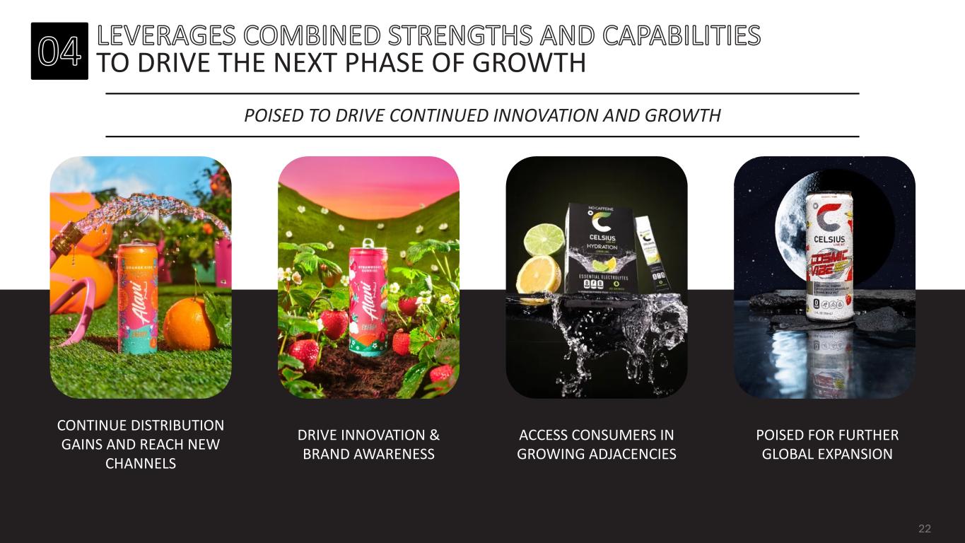 EXPECTED TO DRIVE INCREMENTAL CATEGORY GROWTH TARGET AUDIENCE Gender-neutral, performance-driven with broad appeal to fitness enthusiasts and beyond Female-focused, lifestyle-oriented for consumers seeking a fun, approachable brand Functionality for athletes and fitness-focused individuals Centered around community, empowerment and wellness for young women Diverse portfolio of fruit-forward, refreshing flavors Bright, playful flavors BRAND POSITIONING FLAVOR INNOVATION Sleek, minimalist design with broad consumer appeal Vibrant, pastel color palette and feminine design AESTHETIC TARGET AUDIENCE BRAND POSITIONING FLAVOR INNOVATION AESTHETIC 21