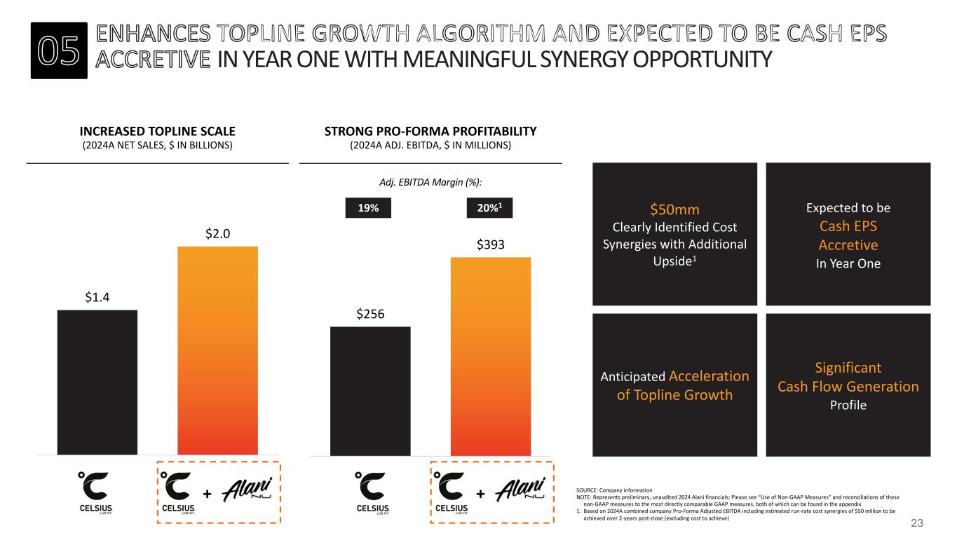 TO CAPITAL ALLOCATION M&A STRATEGY SHAREHOLDER ALIGNMENT FINANCIAL IMPACT BALANCE SHEET STRENGTH Targeted and strategic approach to M&A with complementary acquisition in core energy category while remaining disciplined on valuation REPRESENTS ATTRACTIVE VALUATION OF LESS THAN 3x 2024A ALANI NU REVENUE AND APPROXIMATELY 12x FULLY SYNERGIZED 2024A ALANI NU ADJUSTED EBITDA1 Expected to be accretive to Cash EPS in the first full year with enhanced scale and growth algorithm alongside meaningful cost synergies CASH EPS ACCRETIVE IN YEAR 1 Leadership continuity with TSA in place at closing to help facilitate seamless integration, alignment of long-term interests and continued business momentum ~8.7 PRO-FORMA OWNERSHIP SUBJECT TO A LOCK-UP AGREEMENT Modest pro-forma net leverage with significant cash on balance sheet and strong cash flow generation to preserve optionality and drive continued growth investment ~1.0X PF NET LEVERAGE WITH ~$500mm PF CASH ON BALANCE SHEET2 WITH STRONG CASH FLOW GENERATION TO SUPPORT DELEVERAGING SOURCE: Company information NOTE: Represents preliminary, unaudited 2024 Alani financials; Please see “Use of Non-GAAP Measures” and reconciliations of these non-GAAP measures to the most directly comparable GAAP measures, both of which can be found in the appendix 1. Based on 2024A Alani Nu Adjusted EBITDA including estimated run-rate cost synergies of $50 million to be achieved over 2-years post-close (excluding cost to achieve) and purchase price net of ~$150 million tax benefit step-up (net present value) 2. Based on 2024A combined company Pro-Forma Adjusted EBITDA including estimated run-rate cost synergies of $50 million (excluding cost to achieve). Excludes transaction fees & expenses 24
