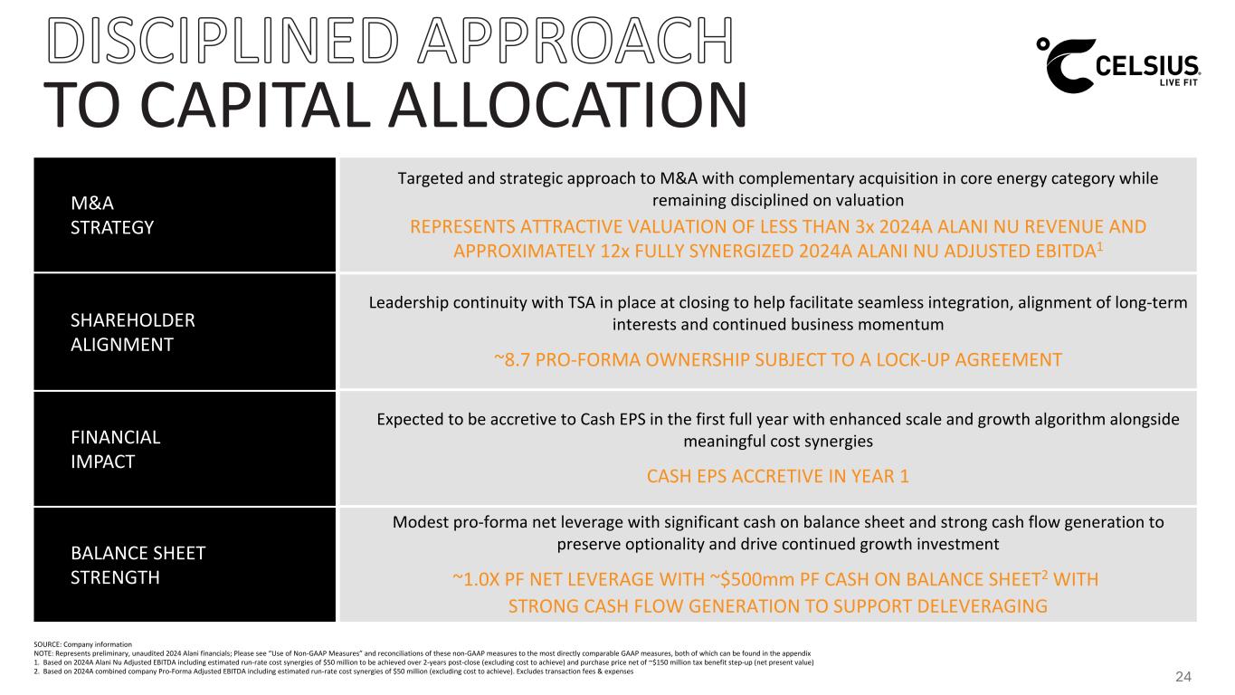 IN YEAR ONE WITH MEANINGFUL SYNERGY OPPORTUNITY $1.4 $2.0 $256 $393 INCREASED TOPLINE SCALE (2024A NET SALES, $ IN BILLIONS) STRONG PRO-FORMA PROFITABILITY (2024A ADJ. EBITDA, $ IN MILLIONS) $50mm Clearly Identified Cost Synergies with Additional Upside1 Expected to be Cash EPS Accretive In Year One Anticipated Acceleration of Topline Growth Significant Cash Flow Generation Profile 19% 20%1 Adj. EBITDA Margin (%): SOURCE: Company information NOTE: Represents preliminary, unaudited 2024 Alani financials; Please see “Use of Non-GAAP Measures” and reconciliations of these non-GAAP measures to the most directly comparable GAAP measures, both of which can be found in the appendix 1. Based on 2024A combined company Pro-Forma Adjusted EBITDA including estimated run-rate cost synergies of $50 million to be achieved over 2-years post-close (excluding cost to achieve) + + 23