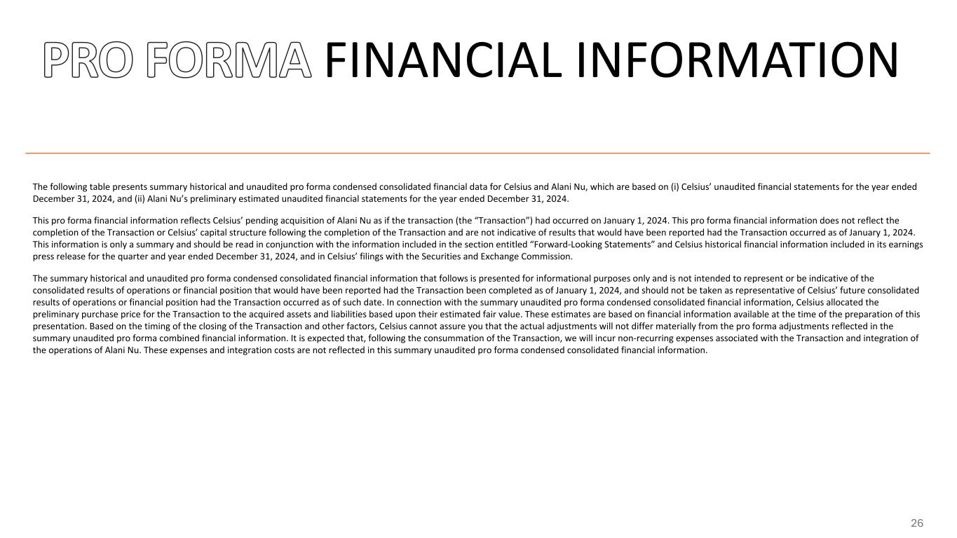 FINANCIAL INFORMATION The following table presents summary historical and unaudited pro forma condensed consolidated financial data for Celsius and Alani Nu, which are based on (i) Celsius’ unaudited financial statements for the year ended December 31, 2024, and (ii) Alani Nu’s preliminary estimated unaudited financial statements for the year ended December 31, 2024. This pro forma financial information reflects Celsius’ pending acquisition of Alani Nu as if the transaction (the “Transaction”) had occurred on January 1, 2024. This pro forma financial information does not reflect the completion of the Transaction or Celsius’ capital structure following the completion of the Transaction and are not indicative of results that would have been reported had the Transaction occurred as of January 1, 2024. This information is only a summary and should be read in conjunction with the information included in the section entitled “Forward-Looking Statements” and Celsius historical financial information included in its earnings press release for the quarter and year ended December 31, 2024, and in Celsius’ filings with the Securities and Exchange Commission. The summary historical and unaudited pro forma condensed consolidated financial information that follows is presented for informational purposes only and is not intended to represent or be indicative of the consolidated results of operations or financial position that would have been reported had the Transaction been completed as of January 1, 2024, and should not be taken as representative of Celsius’ future consolidated results of operations or financial position had the Transaction occurred as of such date. In connection with the summary unaudited pro forma condensed consolidated financial information, Celsius allocated the preliminary purchase price for the Transaction to the acquired assets and liabilities based upon their estimated fair value. These estimates are based on financial information available at the time of the preparation of this presentation. Based on the timing of the closing of the Transaction and other factors, Celsius cannot assure you that the actual adjustments will not differ materially from the pro forma adjustments reflected in the summary unaudited pro forma combined financial information. It is expected that, following the consummation of the Transaction, we will incur non-recurring expenses associated with the Transaction and integration of the operations of Alani Nu. These expenses and integration costs are not reflected in this summary unaudited pro forma condensed consolidated financial information. 26