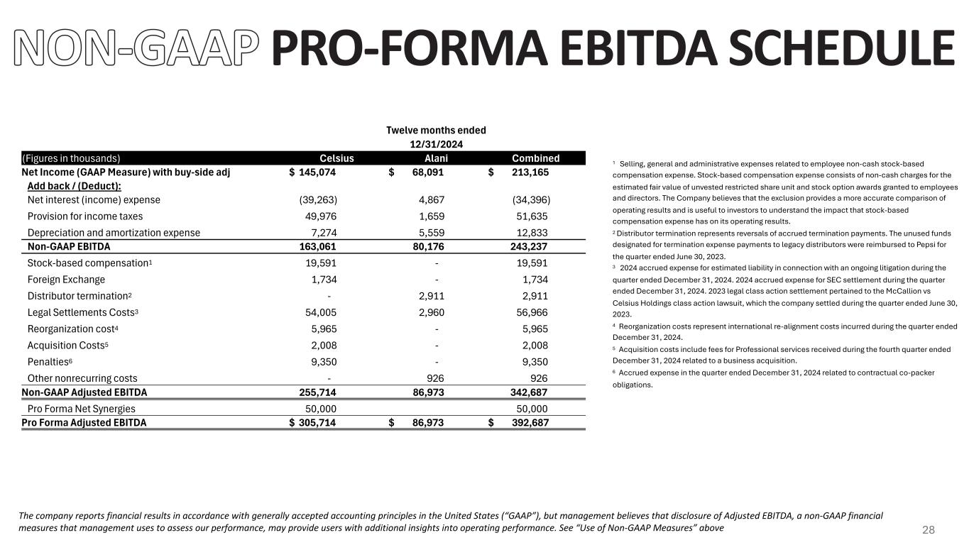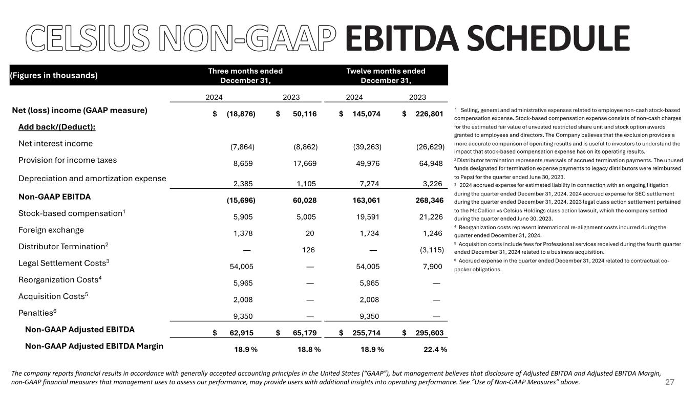 EBITDA SCHEDULE The company reports financial results in accordance with generally accepted accounting principles in the United States (“GAAP”), but management believes that disclosure of Adjusted EBITDA and Adjusted EBITDA Margin, non-GAAP financial measures that management uses to assess our performance, may provide users with additional insights into operating performance. See “Use of Non-GAAP Measures” above. (Figures in thousands) Three months ended December 31, Twelve months ended December 31, 2024 2023 2024 2023 Net (loss) income (GAAP measure) $ (18,876) $ 50,116 $ 145,074 $ 226,801 Add back/(Deduct): Net interest income (7,864) (8,862) (39,263) (26,629) Provision for income taxes 8,659 17,669 49,976 64,948 Depreciation and amortization expense 2,385 1,105 7,274 3,226 Non-GAAP EBITDA (15,696) 60,028 163,061 268,346 Stock-based compensation1 5,905 5,005 19,591 21,226 Foreign exchange 1,378 20 1,734 1,246 Distributor Termination2 — 126 — (3,115) Legal Settlement Costs3 54,005 — 54,005 7,900 Reorganization Costs4 5,965 — 5,965 — Acquisition Costs5 2,008 — 2,008 — Penalties6 9,350 — 9,350 — Non-GAAP Adjusted EBITDA $ 62,915 $ 65,179 $ 255,714 $ 295,603 Non-GAAP Adjusted EBITDA Margin 18.9 % 18.8 % 18.9 % 22.4 % 1 Selling, general and administrative expenses related to employee non-cash stock-based compensation expense. Stock-based compensation expense consists of non-cash charges for the estimated fair value of unvested restricted share unit and stock option awards granted to employees and directors. The Company believes that the exclusion provides a more accurate comparison of operating results and is useful to investors to understand the impact that stock-based compensation expense has on its operating results. 2 Distributor termination represents reversals of accrued termination payments. The unused funds designated for termination expense payments to legacy distributors were reimbursed to Pepsi for the quarter ended June 30, 2023. 3 2024 accrued expense for estimated liability in connection with an ongoing litigation during the quarter ended December 31, 2024. 2024 accrued expense for SEC settlement during the quarter ended December 31, 2024. 2023 legal class action settlement pertained to the McCallion vs Celsius Holdings class action lawsuit, which the company settled during the quarter ended June 30, 2023. 4 Reorganization costs represent international re-alignment costs incurred during the quarter ended December 31, 2024. 5 Acquisition costs include fees for Professional services received during the fourth quarter ended December 31, 2024 related to a business acquisition. 6 Accrued expense in the quarter ended December 31, 2024 related to contractual co- packer obligations. 27