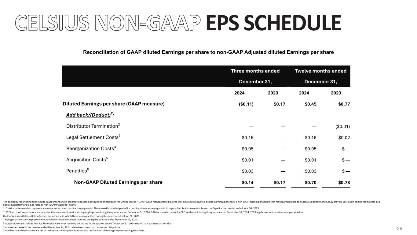 EPS SCHEDULE The company reports financial results in accordance with generally accepted accounting principles in the United States (“GAAP”), but management believes that disclosure adjusted diluted earnings per share, a non-GAAP financial measure that management uses to assess our performance, may provide users with additional insights into operating performance. See “Use of Non-GAAP Measures” above. Three months ended Twelve months ended December 31, December 31, 2024 2023 2024 2023 Diluted Earnings per share (GAAP measure) ($0.11) $0.17 $0.45 $0.77 Add back/(Deduct)7: Distributor Termination2 — — — ($0.01) Legal Settlement Costs3 $0.16 — $0.16 $0.02 Reorganization Costs4 $0.05 — $0.05 $ — Acquisition Costs5 $0.01 — $0.01 $ — Penalties6 $0.03 — $0.03 $ — Non-GAAP Diluted Earnings per share $0.14 $0.17 $0.70 $0.78 Reconciliation of GAAP diluted Earnings per share to non-GAAP Adjusted diluted Earnings per share 2 Distributor termination represents reversals of accrued termination payments. The unused funds designated for termination expense payments to legacy distributors were reimbursed to Pepsi for the quarter ended June 30, 2023. 3 2024 accrued expense for estimated liability in connection with an ongoing litigation during the quarter ended December 31, 2024. 2024 accrued expense for SEC settlement during the quarter ended December 31, 2024. 2023 legal class action settlement pertained to the McCallion vs Celsius Holdings class action lawsuit, which the company settled during the quarter ended June 30, 2023. 4 Reorganization costs represent international re-alignment costs incurred during the quarter ended December 31, 2024. 5 Acquisition costs include fees for Professional services received during the fourth quarter ended December 31, 2024 related to a business acquisition. 6 Accrued expense in the quarter ended December 31, 2024 related to contractual co-packer obligations. 7 Add backs and deductions are net of their respective impacts from tax and reallocation of earnings to participating securities. 29