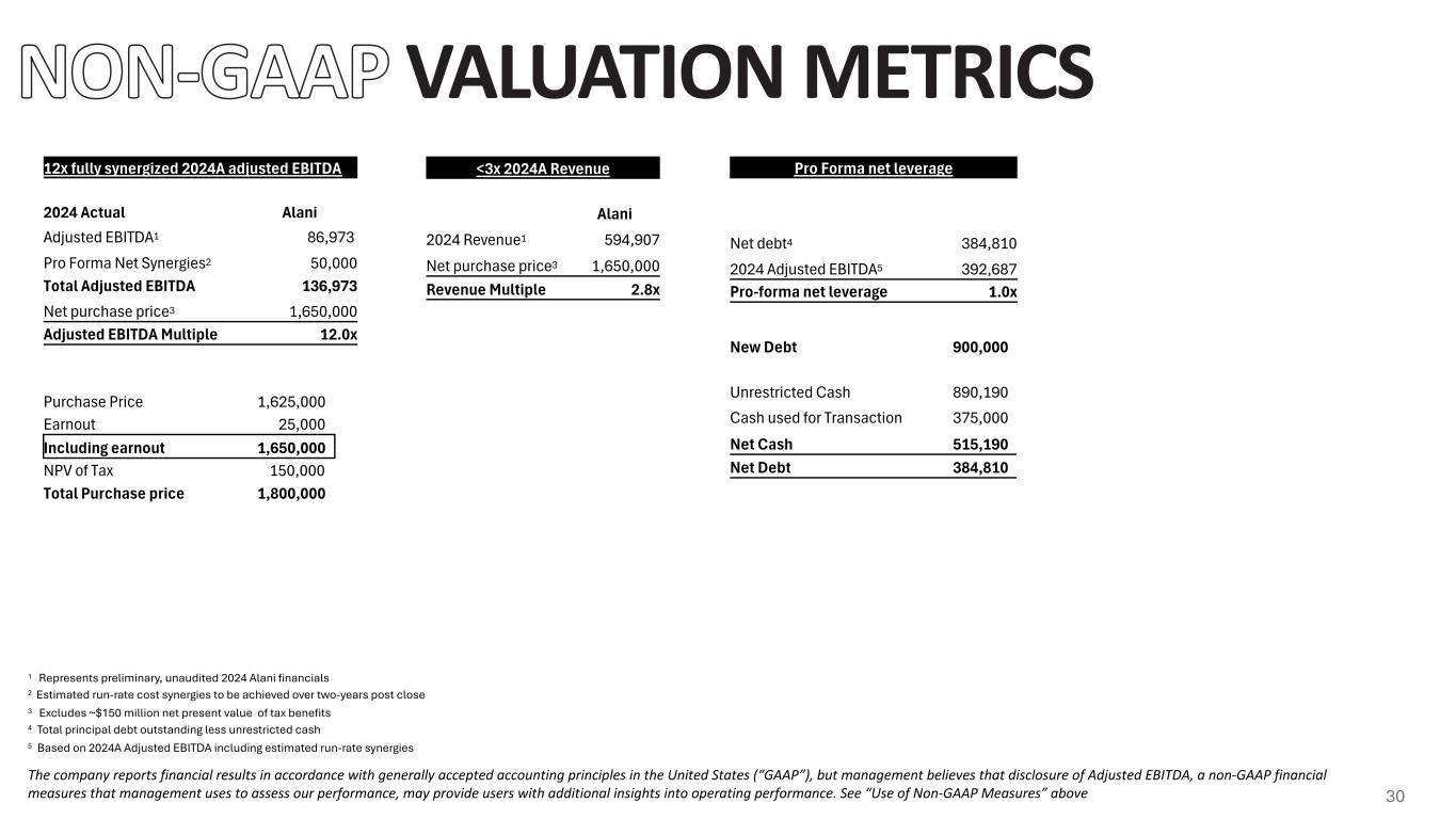 VALUATION METRICS The company reports financial results in accordance with generally accepted accounting principles in the United States (“GAAP”), but management believes that disclosure of Adjusted EBITDA, a non-GAAP financial measures that management uses to assess our performance, may provide users with additional insights into operating performance. See “Use of Non-GAAP Measures” above 12x fully synergized 2024A adjusted EBITDA 2024 Actual Alani Adjusted EBITDA1 86,973 Pro Forma Net Synergies2 50,000 Total Adjusted EBITDA 136,973 Net purchase price3 1,650,000 Adjusted EBITDA Multiple 12.0x 1 Represents preliminary, unaudited 2024 Alani financials 2 Estimated run-rate cost synergies to be achieved over two-years post close 3 Excludes ~$150 million net present value of tax benefits 4 Total principal debt outstanding less unrestricted cash 5 Based on 2024A Adjusted EBITDA including estimated run-rate synergies Purchase Price 1,625,000 Earnout 25,000 Including earnout 1,650,000 NPV of Tax 150,000 Total Purchase price 1,800,000 <3x 2024A Revenue Alani 2024 Revenue1 594,907 Net purchase price3 1,650,000 Revenue Multiple 2.8x Pro Forma net leverage Net debt4 384,810 2024 Adjusted EBITDA5 392,687 Pro-forma net leverage 1.0x New Debt 900,000 Unrestricted Cash 890,190 Cash used for Transaction 375,000 Net Cash 515,190 Net Debt 384,810 30