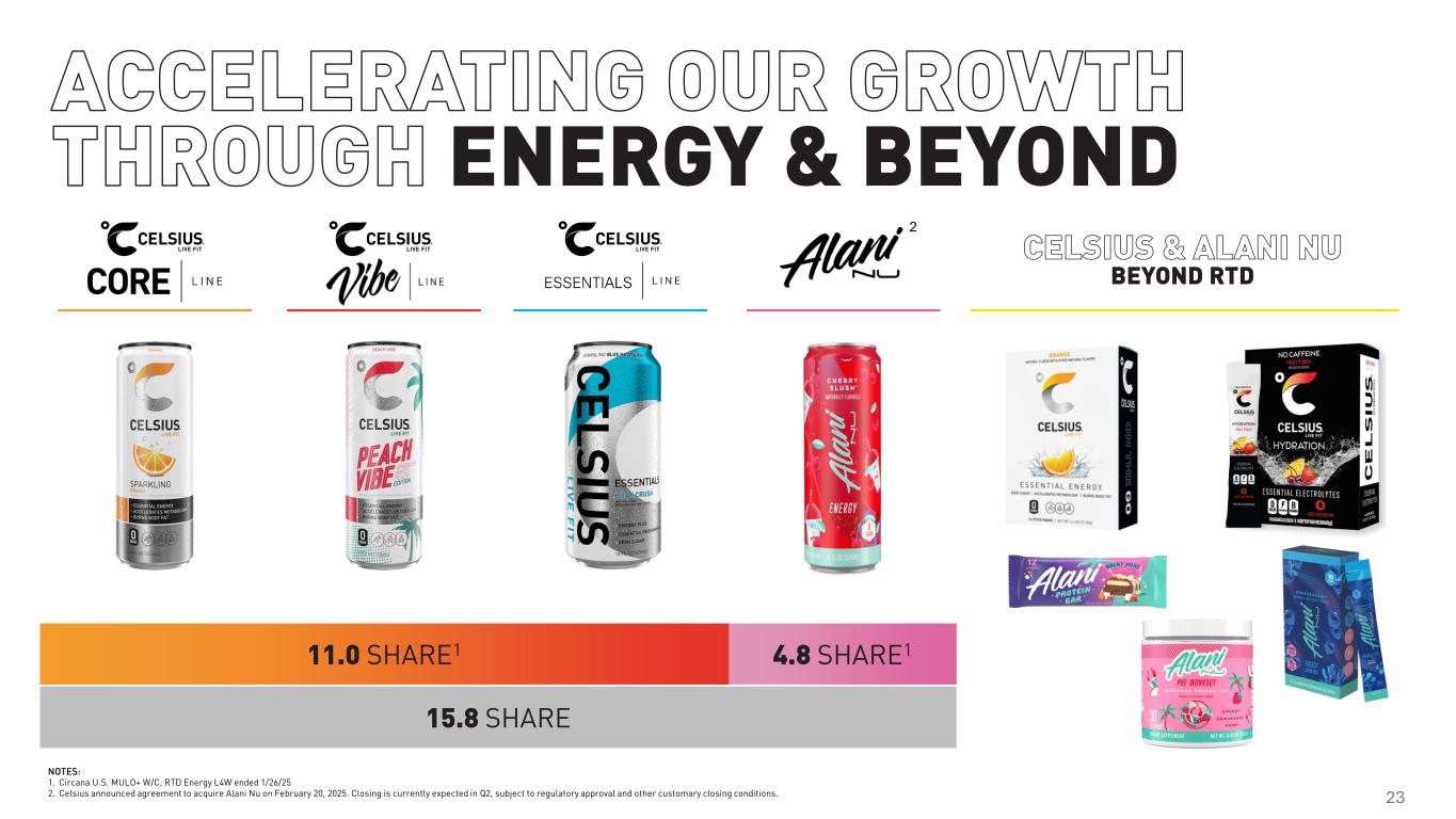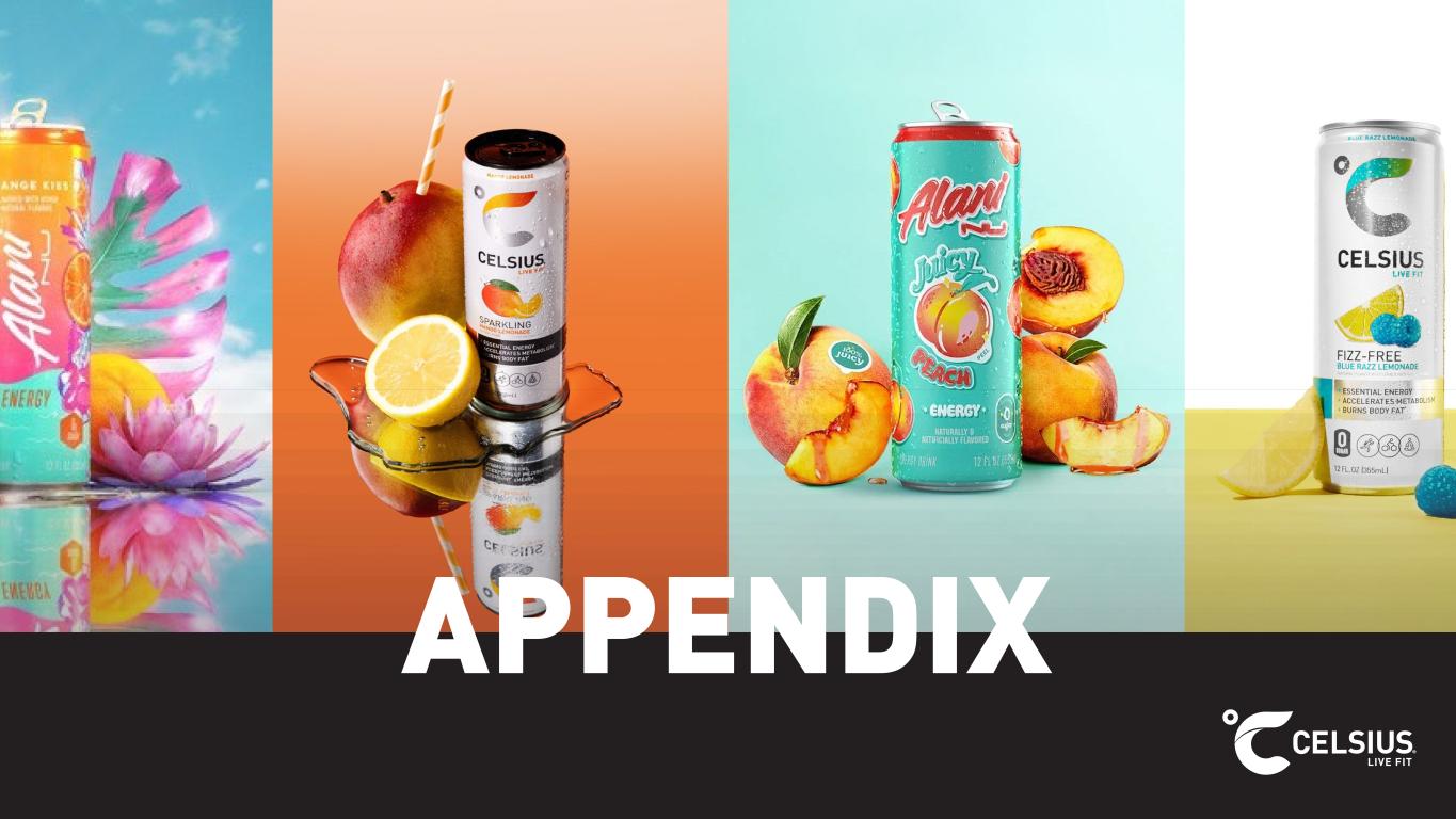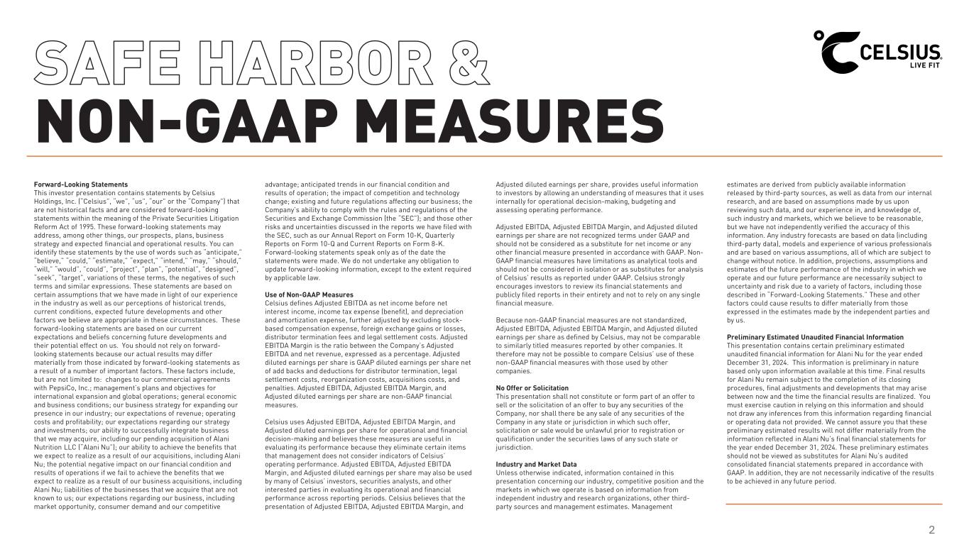 Forward-Looking Statements This investor presentation contains statements by Celsius Holdings, Inc. (“Celsius”, “we”, “us”, “our” or the “Company”) that are not historical facts and are considered forward-looking statements within the meaning of the Private Securities Litigation Reform Act of 1995. These forward-looking statements may address, among other things, our prospects, plans, business strategy and expected financial and operational results. You can identify these statements by the use of words such as “anticipate,” “believe,” “could,” “estimate,” “expect,” “intend,” “may,” “should,” “will,” “would”, ”could”, ”project”, ”plan”, “potential”, ”designed”, “seek”, “target”, variations of these terms, the negatives of such terms and similar expressions. These statements are based on certain assumptions that we have made in light of our experience in the industry as well as our perceptions of historical trends, current conditions, expected future developments and other factors we believe are appropriate in these circumstances. These forward-looking statements are based on our current expectations and beliefs concerning future developments and their potential effect on us. You should not rely on forward- looking statements because our actual results may differ materially from those indicated by forward-looking statements as a result of a number of important factors. These factors include, but are not limited to: changes to our commercial agreements with PepsiCo, Inc.; management’s plans and objectives for international expansion and global operations; general economic and business conditions; our business strategy for expanding our presence in our industry; our expectations of revenue; operating costs and profitability; our expectations regarding our strategy and investments; our ability to successfully integrate business that we may acquire, including our pending acquisition of Alani Nutrition LLC (“Alani Nu”); our ability to achieve the benefits that we expect to realize as a result of our acquisitions, including Alani Nu; the potential negative impact on our financial condition and results of operations if we fail to achieve the benefits that we expect to realize as a result of our business acquisitions, including Alani Nu; liabilities of the businesses that we acquire that are not known to us; our expectations regarding our business, including market opportunity, consumer demand and our competitive advantage; anticipated trends in our financial condition and results of operation; the impact of competition and technology change; existing and future regulations affecting our business; the Company’s ability to comply with the rules and regulations of the Securities and Exchange Commission (the “SEC”); and those other risks and uncertainties discussed in the reports we have filed with the SEC, such as our Annual Report on Form 10-K, Quarterly Reports on Form 10-Q and Current Reports on Form 8-K. Forward-looking statements speak only as of the date the statements were made. We do not undertake any obligation to update forward-looking information, except to the extent required by applicable law. Use of Non-GAAP Measures Celsius defines Adjusted EBITDA as net income before net interest income, income tax expense (benefit), and depreciation and amortization expense, further adjusted by excluding stock- based compensation expense, foreign exchange gains or losses, distributor termination fees and legal settlement costs. Adjusted EBITDA Margin is the ratio between the Company’s Adjusted EBITDA and net revenue, expressed as a percentage. Adjusted diluted earnings per share is GAAP diluted earnings per share net of add backs and deductions for distributor termination, legal settlement costs, reorganization costs, acquisitions costs, and penalties. Adjusted EBITDA, Adjusted EBITDA Margin, and Adjusted diluted earnings per share are non-GAAP financial measures. Celsius uses Adjusted EBITDA, Adjusted EBITDA Margin, and Adjusted diluted earnings per share for operational and financial decision-making and believes these measures are useful in evaluating its performance because they eliminate certain items that management does not consider indicators of Celsius’ operating performance. Adjusted EBITDA, Adjusted EBITDA Margin, and Adjusted diluted earnings per share may also be used by many of Celsius’ investors, securities analysts, and other interested parties in evaluating its operational and financial performance across reporting periods. Celsius believes that the presentation of Adjusted EBITDA, Adjusted EBITDA Margin, and Adjusted diluted earnings per share, provides useful information to investors by allowing an understanding of measures that it uses internally for operational decision-making, budgeting and assessing operating performance. Adjusted EBITDA, Adjusted EBITDA Margin, and Adjusted diluted earnings per share are not recognized terms under GAAP and should not be considered as a substitute for net income or any other financial measure presented in accordance with GAAP. Non- GAAP financial measures have limitations as analytical tools and should not be considered in isolation or as substitutes for analysis of Celsius’ results as reported under GAAP. Celsius strongly encourages investors to review its financial statements and publicly filed reports in their entirety and not to rely on any single financial measure. Because non-GAAP financial measures are not standardized, Adjusted EBITDA, Adjusted EBITDA Margin, and Adjusted diluted earnings per share as defined by Celsius, may not be comparable to similarly titled measures reported by other companies. It therefore may not be possible to compare Celsius’ use of these non-GAAP financial measures with those used by other companies. No Offer or Solicitation This presentation shall not constitute or form part of an offer to sell or the