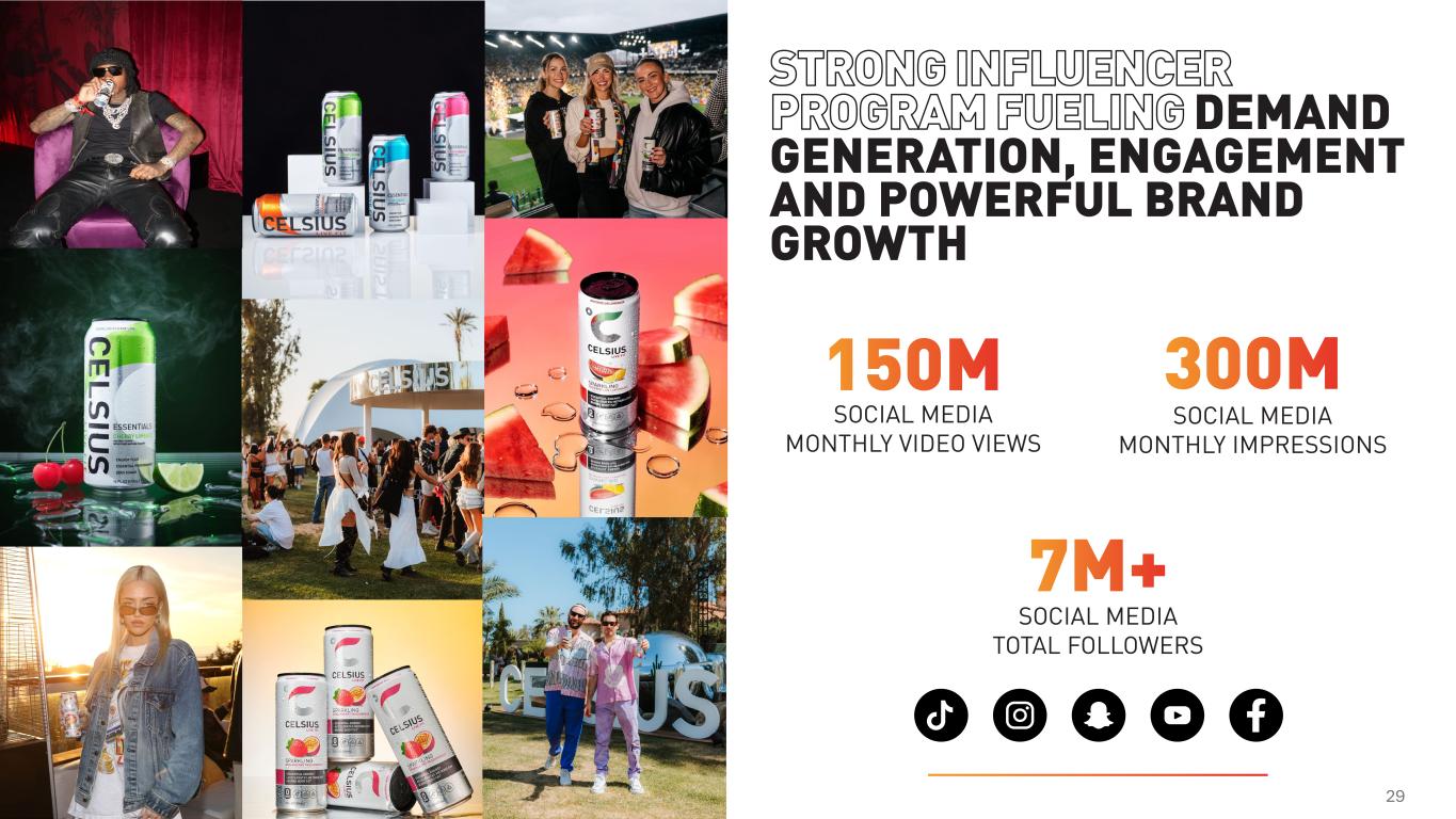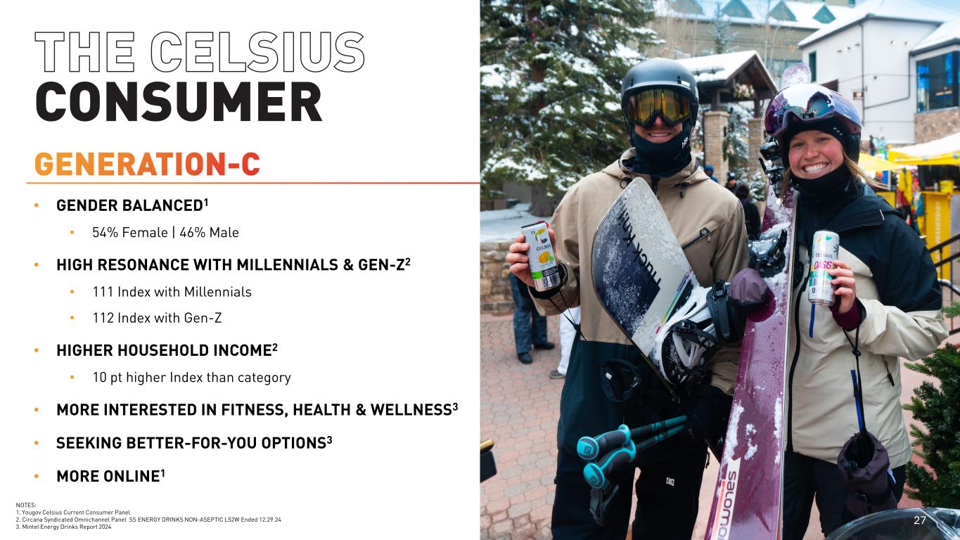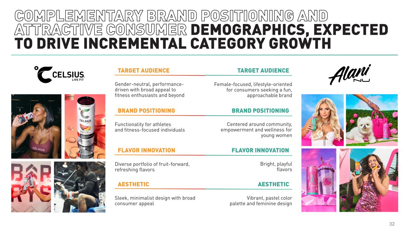 Forward-Looking Statements This investor presentation contains statements by Celsius Holdings, Inc. (“Celsius”, “we”, “us”, “our” or the “Company”) that are not historical facts and are considered forward-looking statements within the meaning of the Private Securities Litigation Reform Act of 1995. These forward-looking statements may address, among other things, our prospects, plans, business strategy and expected financial and operational results. You can identify these statements by the use of words such as “anticipate,” “believe,” “could,” “estimate,” “expect,” “intend,” “may,” “should,” “will,” “would”, ”could”, ”project”, ”plan”, “potential”, ”designed”, “seek”, “target”, variations of these terms, the negatives of such terms and similar expressions. These statements are based on certain assumptions that we have made in light of our experience in the industry as well as our perceptions of historical trends, current conditions, expected future developments and other factors we believe are appropriate in these circumstances. These forward-looking statements are based on our current expectations and beliefs concerning future developments and their potential effect on us. You should not rely on forward- looking statements because our actual results may differ materially from those indicated by forward-looking statements as a result of a number of important factors. These factors include, but are not limited to: changes to our commercial agreements with PepsiCo, Inc.; management’s plans and objectives for international expansion and global operations; general economic and business conditions; our business strategy for expanding our presence in our industry; our expectations of revenue; operating costs and profitability; our expectations regarding our strategy and investments; our ability to successfully integrate business that we may acquire, including our pending acquisition of Alani Nutrition LLC (“Alani Nu”); our ability to achieve the benefits that we expect to realize as a result of our acquisitions, including Alani Nu; the potential negative impact on our financial condition and results of operations if we fail to achieve the benefits that we expect to realize as a result of our business acquisitions, including Alani Nu; liabilities of the businesses that we acquire that are not known to us; our expectations regarding our business, including market opportunity, consumer demand and our competitive advantage; anticipated trends in our financial condition and results of operation; the impact of competition and technology change; existing and future regulations affecting our business; the Company’s ability to comply with the rules and regulations of the Securities and Exchange Commission (the “SEC”); and those other risks and uncertainties discussed in the reports we have filed with the SEC, such as our Annual Report on Form 10-K, Quarterly Reports on Form 10-Q and Current Reports on Form 8-K. Forward-looking statements speak only as of the date the statements were made. We do not undertake any obligation to update forward-looking information, except to the extent required by applicable law. Use of Non-GAAP Measures Celsius defines Adjusted EBITDA as net income before net interest income, income tax expense (benefit), and depreciation and amortization expense, further adjusted by excluding stock- based compensation expense, foreign exchange gains or losses, distributor termination fees and legal settlement costs. Adjusted EBITDA Margin is the ratio between the Company’s Adjusted EBITDA and net revenue, expressed as a percentage. Adjusted diluted earnings per share is GAAP diluted earnings per share net of add backs and deductions for distributor termination, legal settlement costs, reorganization costs, acquisitions costs, and penalties. Adjusted EBITDA, Adjusted EBITDA Margin, and Adjusted diluted earnings per share are non-GAAP financial measures. Celsius uses Adjusted EBITDA, Adjusted EBITDA Margin, and Adjusted diluted earnings per share for operational and financial decision-making and believes these measures are useful in evaluating its performance because they eliminate certain items that management does not consider indicators of Celsius’ operating performance. Adjusted EBITDA, Adjusted EBITDA Margin, and Adjusted diluted earnings per share may also be used by many of Celsius’ investors, securities analysts, and other interested parties in evaluating its operational and financial performance across reporting periods. Celsius believes that the presentation of Adjusted EBITDA, Adjusted EBITDA Margin, and Adjusted diluted earnings per share, provides useful information to investors by allowing an understanding of measures that it uses internally for operational decision-making, budgeting and assessing operating performance. Adjusted EBITDA, Adjusted EBITDA Margin, and Adjusted diluted earnings per share are not recognized terms under GAAP and should not be considered as a substitute for net income or any other financial measure presented in accordance with GAAP. Non- GAAP financial measures have limitations as analytical tools and should not be considered in isolation or as substitutes for analysis of Celsius’ results as reported under GAAP. Celsius strongly encourages investors to review its financial statements and publicly filed reports in their entirety and not to rely on any single financial measure. Because non-GAAP financial measures are not standardized, Adjusted EBITDA, Adjusted EBITDA Margin, and Adjusted diluted earnings per share as defined by Celsius, may not be comparable to similarly titled measures reported by other companies. It therefore may not be possible to compare Celsius’ use of these non-GAAP financial measures with those used by other companies. No Offer or Solicitation This presentation shall not constitute or form part of an offer to sell or the