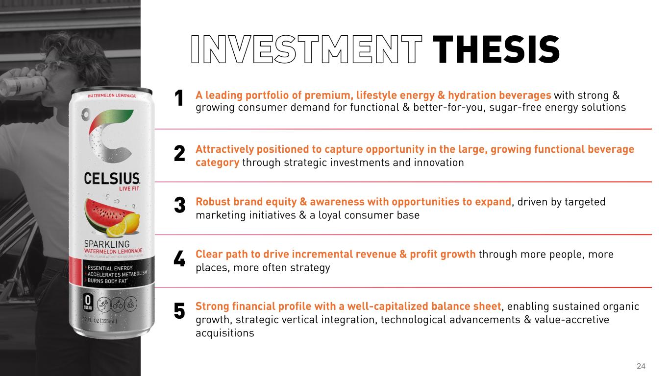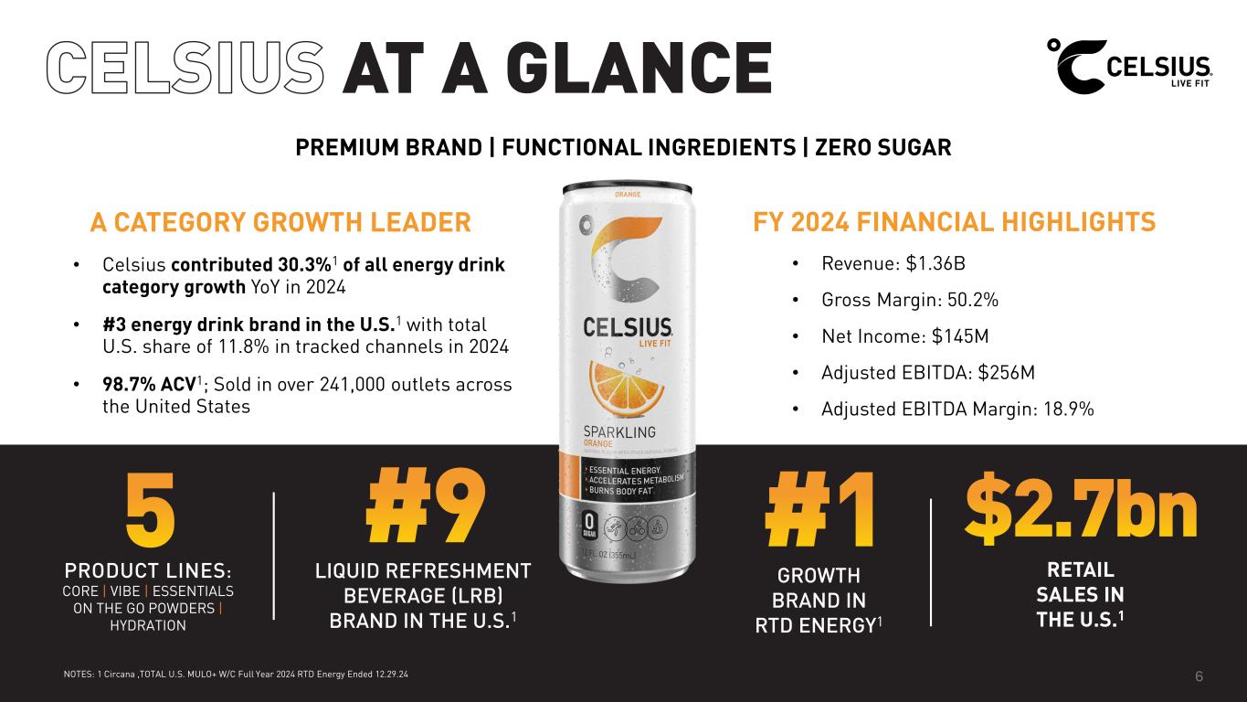 A leading portfolio of premium, lifestyle energy & hydration beverages with strong & growing consumer demand for functional & better-for-you, sugar-free energy solutions THESIS 1 2 3 4 5 Robust brand equity & awareness with opportunities to expand, driven by targeted marketing initiatives & a loyal consumer base Clear path to drive incremental revenue & profit growth through more people, more places, more often strategy Strong financial profile with a well-capitalized balance sheet, enabling sustained organic growth, strategic vertical integration, technological advancements & value-accretive acquisitions Attractively positioned to capture opportunity in the large, growing functional beverage category through strategic investments and innovation 24