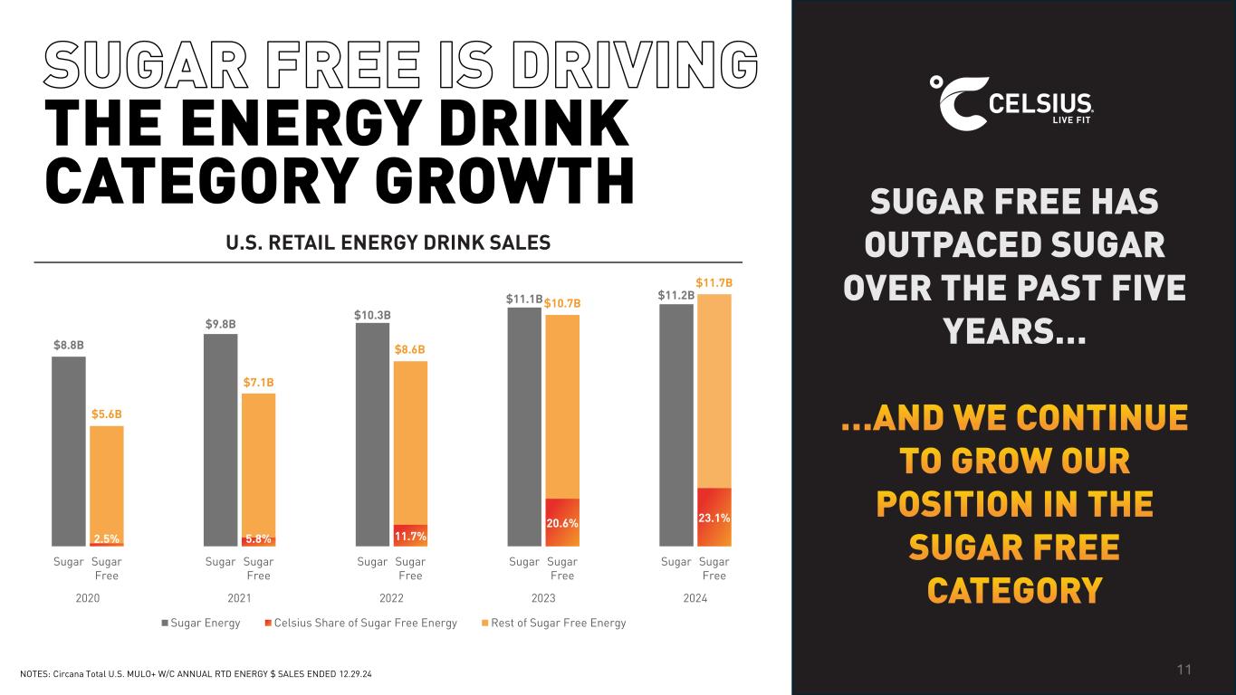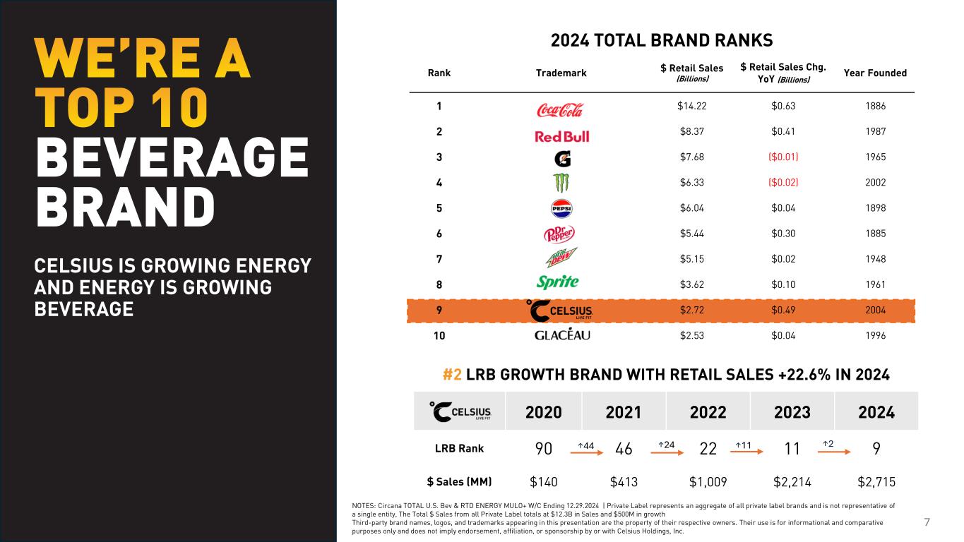 #2 LRB GROWTH BRAND WITH RETAIL SALES +22.6% IN 2024 2020 2021 2022 2023 2024 LRB Rank 90 46 22 11 9 $ Sales (MM) $140 $413 $1,009 $2,214 $2,715 NOTES: Circana TOTAL U.S. Bev & RTD ENERGY MULO+ W/C Ending 12.29.2024 | Private Label represents an aggregate of all private label brands and is not representative of a single entity, The Total $ Sales from all Private Label totals at $12.3B in Sales and $500M in growth Third-party brand names, logos, and trademarks appearing in this presentation are the property of their respective owners. Their use is for informational and comparative purposes only and does not imply endorsement, affiliation, or sponsorship by or with Celsius Holdings, Inc. BEVERAGE BRAND CELSIUS IS GROWING ENERGY AND ENERGY IS GROWING BEVERAGE 2024 TOTAL BRAND RANKS Rank Trademark $ Retail Sales (Billions) $ Retail Sales Chg. YoY (Billions) Year Founded 1 $14.22 $0.63 1886 2 $8.37 $0.41 1987 3 $7.68 ($0.01) 1965 4 $6.33 ($0.02) 2002 5 $6.04 $0.04 1898 6 $5.44 $0.30 1885 7 $5.15 $0.02 1948 8 $3.62 $0.10 1961 9 $2.72 $0.49 2004 10 $2.53 $0.04 1996 ↑44 ↑24 ↑11 ↑2 7