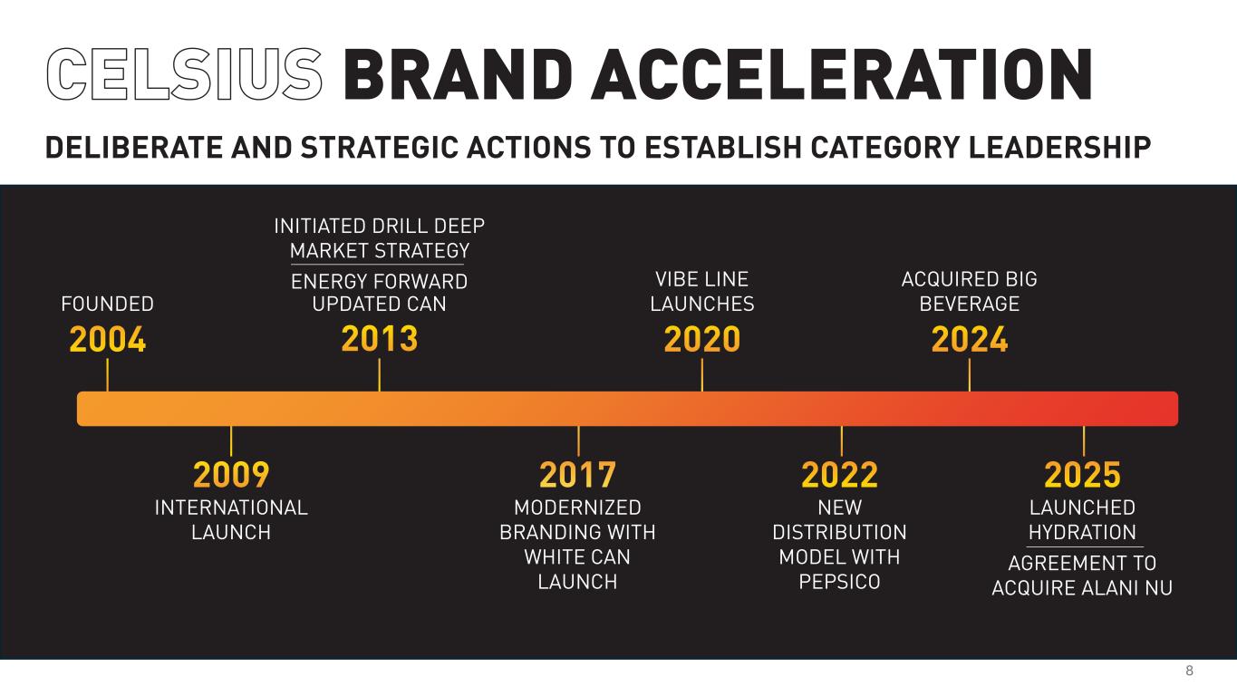DELIBERATE AND STRATEGIC ACTIONS TO ESTABLISH CATEGORY LEADERSHIP BRAND ACCELERATION FOUNDED INTERNATIONAL LAUNCH MODERNIZED BRANDING WITH WHITE CAN LAUNCH VIBE LINE LAUNCHES NEW DISTRIBUTION MODEL WITH PEPSICO INITIATED DRILL DEEP MARKET STRATEGY ENERGY FORWARD UPDATED CAN LAUNCHED HYDRATION AGREEMENT TO ACQUIRE ALANI NU ACQUIRED BIG BEVERAGE 8