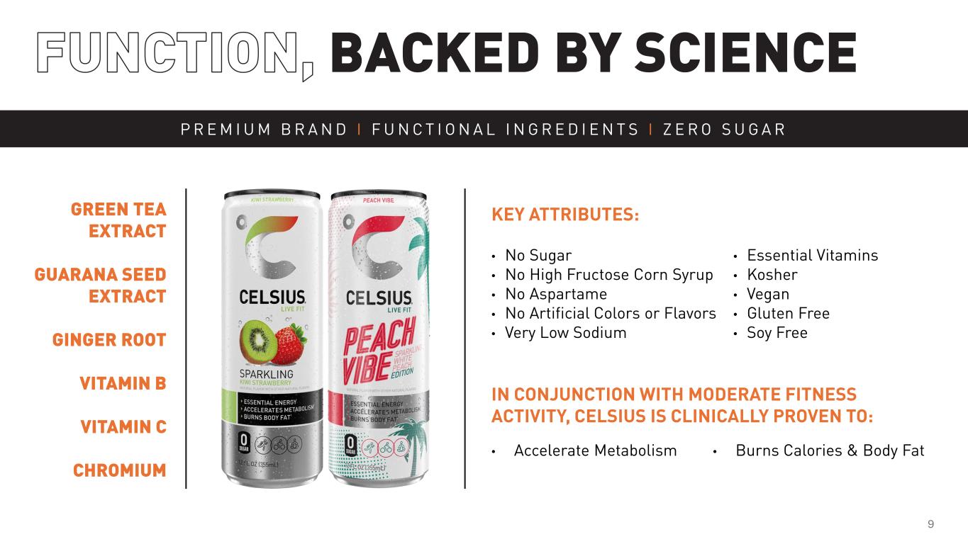 BACKED BY SCIENCE GREEN TEA EXTRACT GUARANA SEED EXTRACT GINGER ROOT VITAMIN B VITAMIN C CHROMIUM P R E M I U M B R A N D I F U N C T I O N A L I N G R E D I E N T S I Z E R O S U G A R KEY ATTRIBUTES: • No Sugar • No High Fructose Corn Syrup • No Aspartame • No Artificial Colors or Flavors • Very Low Sodium • Essential Vitamins • Kosher • Vegan • Gluten Free • Soy Free IN CONJUNCTION WITH MODERATE FITNESS ACTIVITY, CELSIUS IS CLINICALLY PROVEN TO: • Accelerate Metabolism • Burns Calories & Body Fat 9