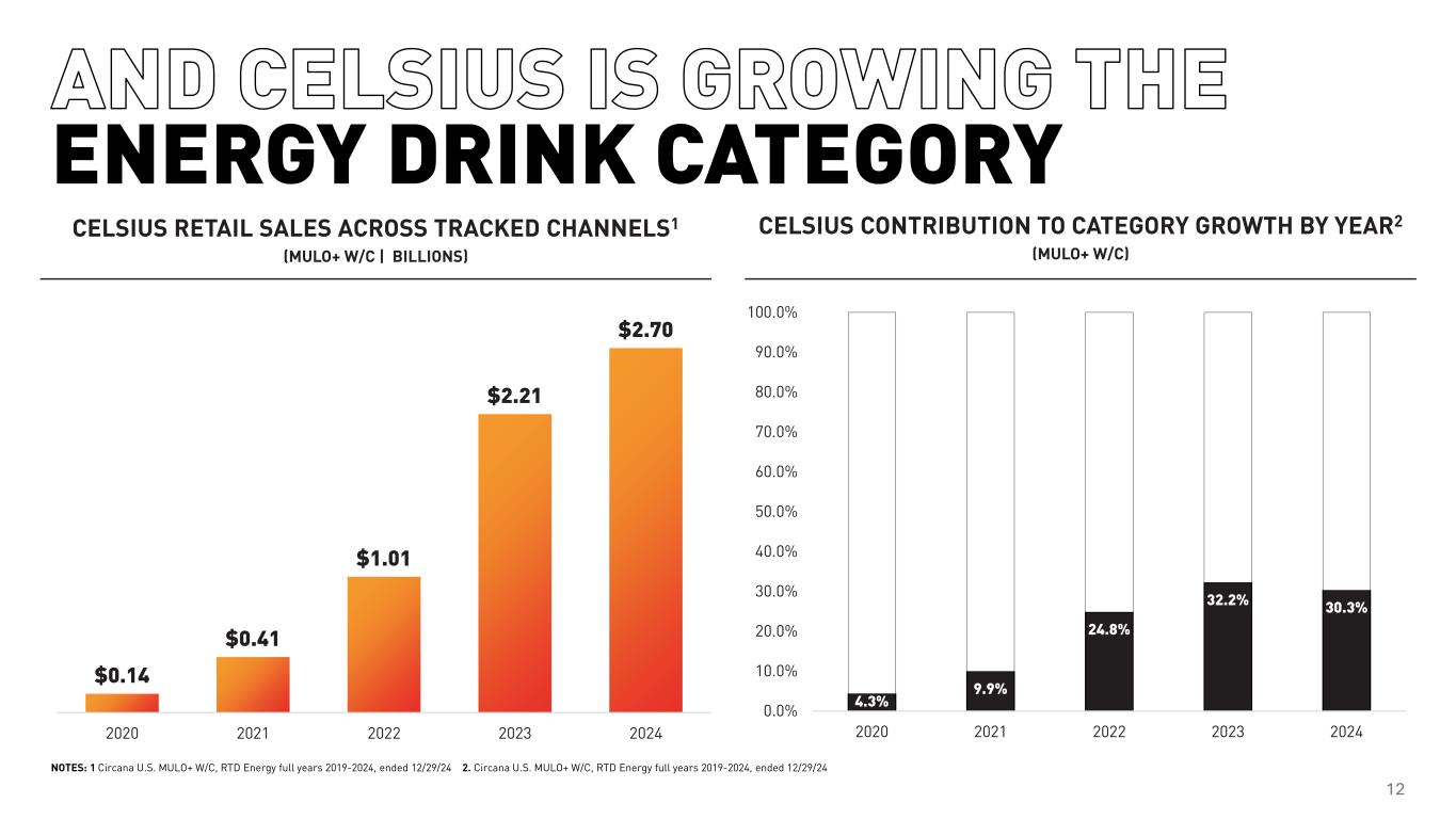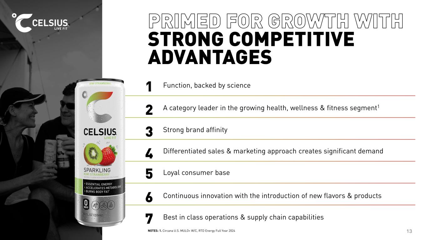 ENERGY DRINK CATEGORY $0.14 $0.41 $1.01 $2.21 $2.70 2020 2021 2022 2023 2024 4.3% 9.9% 24.8% 32.2% 30.3% 0.0% 10.0% 20.0% 30.0% 40.0% 50.0% 60.0% 70.0% 80.0% 90.0% 100.0% 2020 2021 2022 2023 2024 CELSIUS RETAIL SALES ACROSS TRACKED CHANNELS1 (MULO+ W/C | BILLIONS) CELSIUS CONTRIBUTION TO CATEGORY GROWTH BY YEAR2 (MULO+ W/C) NOTES: 1 Circana U.S. MULO+ W/C, RTD Energy full years 2019-2024, ended 12/29/24 2. Circana U.S. MULO+ W/C, RTD Energy full years 2019-2024, ended 12/29/24 12