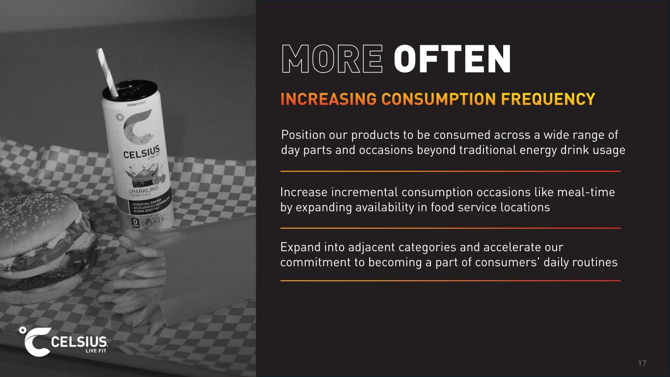 OFTEN Position our products to be consumed across a wide range of day parts and occasions beyond traditional energy drink usage Expand into adjacent categories and accelerate our commitment to becoming a part of consumers' daily routines Increase incremental consumption occasions like meal-time by expanding availability in food service locations 17