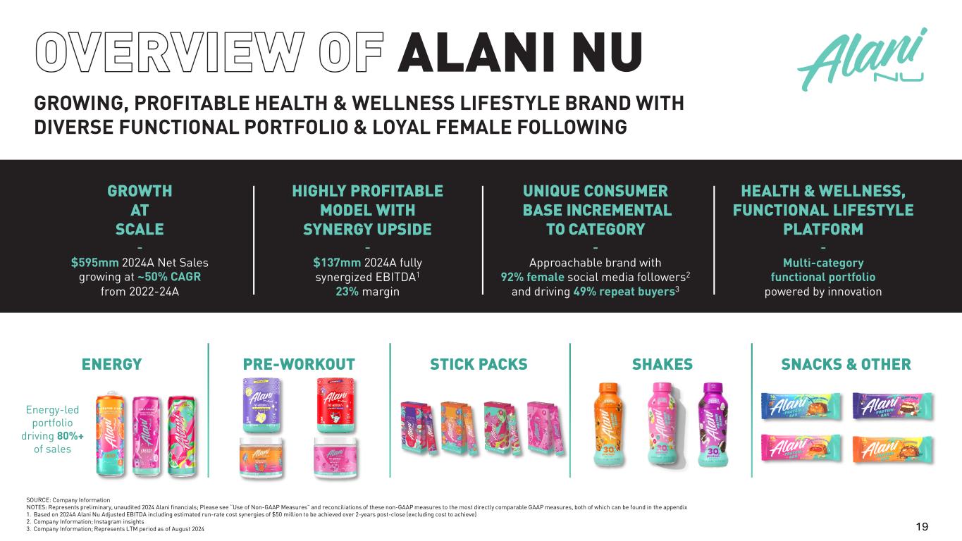 PLATFORM AT THE INTERSECTION OF CONSUMER MEGATRENDS SOURCE: Company information, Circana NOTES: Represents preliminary, unaudited 2024 Alani financials 1. Represents 2024A combined company Pro-Forma sales 2. Combined company Pro-Forma category share based on Circana, MULO+ W/C RTD Energy LTM as of February 2025 3. Based on Top 10 players in Circana, MULO+ W/C RTD Energy 2024; Represents combined company Pro-Forma 2024 growth rate Attractive Consumer Demographics Driving Incremental Category Growth Over-Indexed to Younger, Affluent And Female Consumers ~$2bn Sales Platform1 16% Category Share2 Differentiated Portfolio in the Attractive Energy Category Fastest Growing Portfolio of Scale3 21