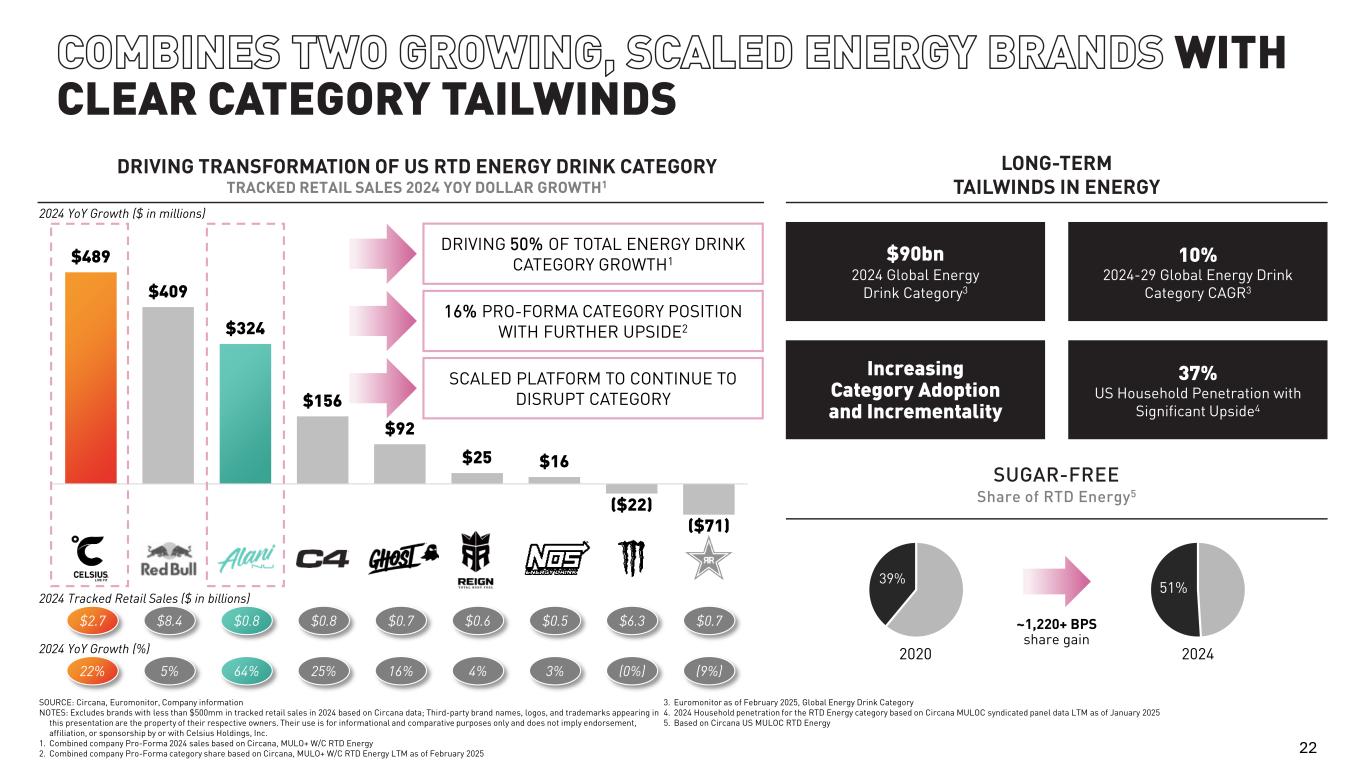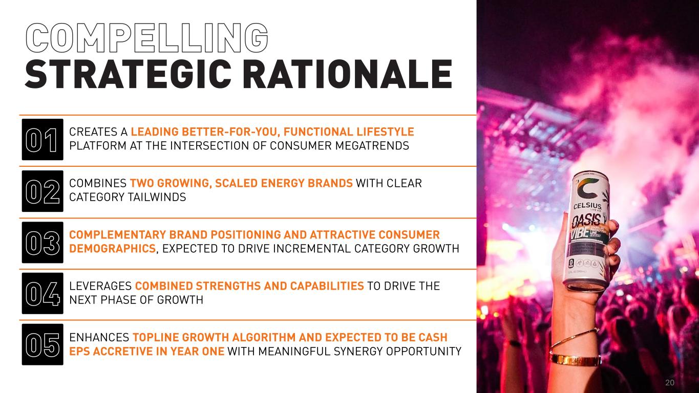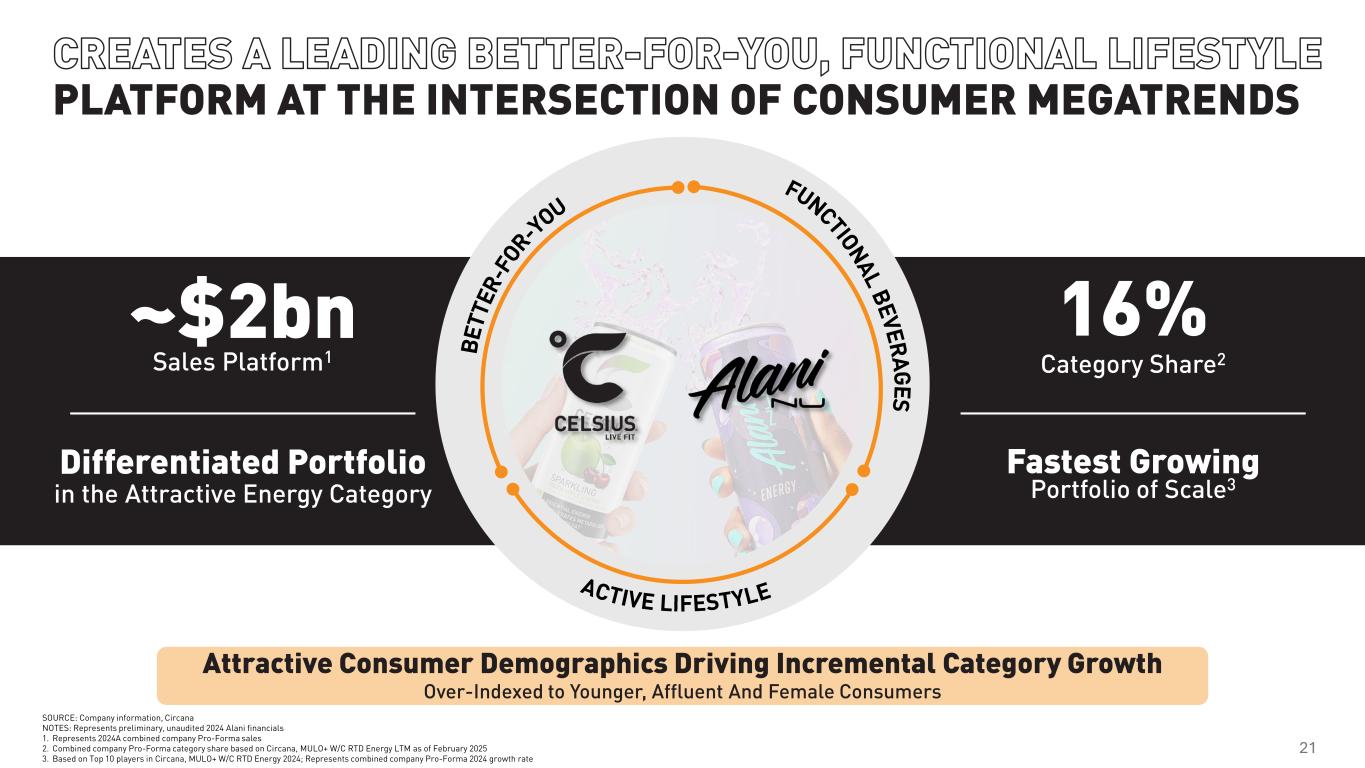 STRATEGIC RATIONALE CREATES A LEADING BETTER-FOR-YOU, FUNCTIONAL LIFESTYLE PLATFORM AT THE INTERSECTION OF CONSUMER MEGATRENDS COMBINES TWO GROWING, SCALED ENERGY BRANDS WITH CLEAR CATEGORY TAILWINDS COMPLEMENTARY BRAND POSITIONING AND ATTRACTIVE CONSUMER DEMOGRAPHICS, EXPECTED TO DRIVE INCREMENTAL CATEGORY GROWTH LEVERAGES COMBINED STRENGTHS AND CAPABILITIES TO DRIVE THE NEXT PHASE OF GROWTH ENHANCES TOPLINE GROWTH ALGORITHM AND EXPECTED TO BE CASH EPS ACCRETIVE IN YEAR ONE WITH MEANINGFUL SYNERGY OPPORTUNITY 20