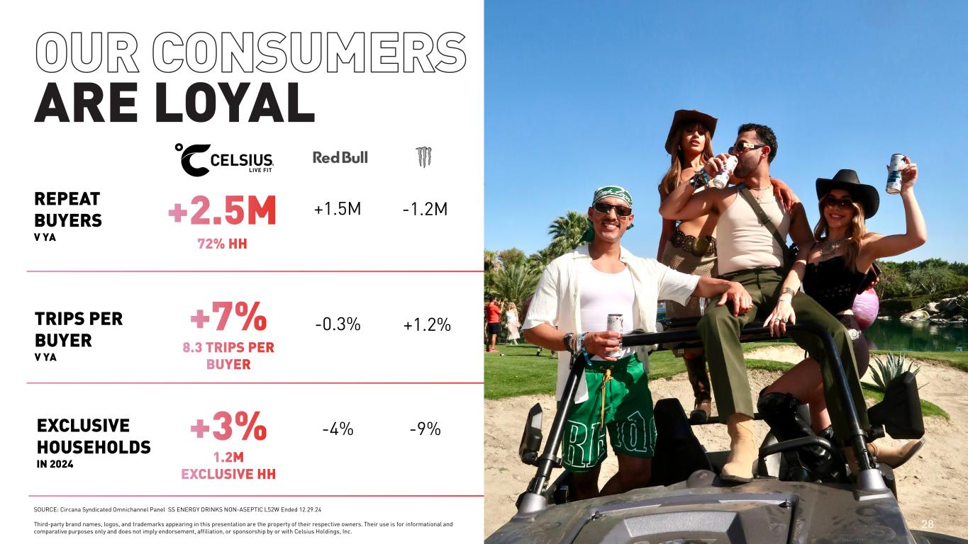 ARE LOYAL SOURCE: Circana Syndicated Omnichannel Panel SS ENERGY DRINKS NON-ASEPTIC L52W Ended 12.29.24 +1.5M -1.2M -0.3% +1.2% -4% -9% REPEAT BUYERS V YA TRIPS PER BUYER V YA EXCLUSIVE HOUSEHOLDS IN 2024 28Third-party brand names, logos, and trademarks appearing in this presentation are the property of their respective owners. Their use is for informational and comparative purposes only and does not imply endorsement, affiliation, or sponsorship by or with Celsius Holdings, Inc.
