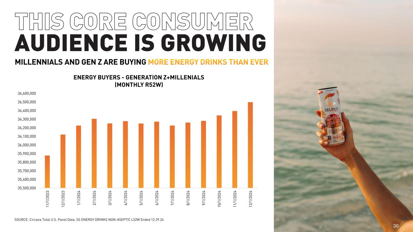 AUDIENCE IS GROWING SOURCE: Circana Total U.S. Panel Data, SS ENERGY DRINKS NON-ASEPTIC L52W Ended 12.29.24 35,500,000 35,600,000 35,700,000 35,800,000 35,900,000 36,000,000 36,100,000 36,200,000 36,300,000 36,400,000 36,500,000 36,600,000 11 /1 /2 02 3 12 /1 /2 02 3 1/ 1/ 20 24 2/ 1/ 20 24 3/ 1/ 20 24 4/ 1/ 20 24 5/ 1/ 20 24 6/ 1/ 20 24 7/ 1/ 20 24 8/ 1/ 20 24 9/ 1/ 20 24 10 /1 /2 02 4 11 /1 /2 02 4 12 /1 /2 02 4 ENERGY BUYERS - GENERATION Z+MILLENIALS (MONTHLY R52W) MILLENNIALS AND GEN Z ARE BUYING 30