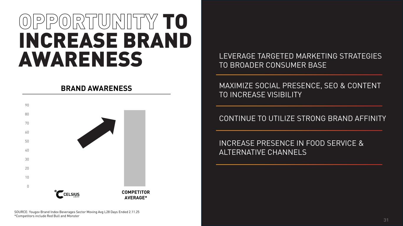 LEVERAGE TARGETED MARKETING STRATEGIES TO BROADER CONSUMER BASE 0 10 20 30 40 50 60 70 80 90 COMPETITOR AVERAGE* SOURCE: Yougov Brand Index Beverages Sector Moving Avg L28 Days Ended 2.11.25 *Competitors include Red Bull and Monster TO INCREASE BRAND AWARENESS BRAND AWARENESS 31 MAXIMIZE SOCIAL PRESENCE, SEO & CONTENT TO INCREASE VISIBILITY CONTINUE TO UTILIZE STRONG BRAND AFFINITY INCREASE PRESENCE IN FOOD SERVICE & ALTERNATIVE CHANNELS
