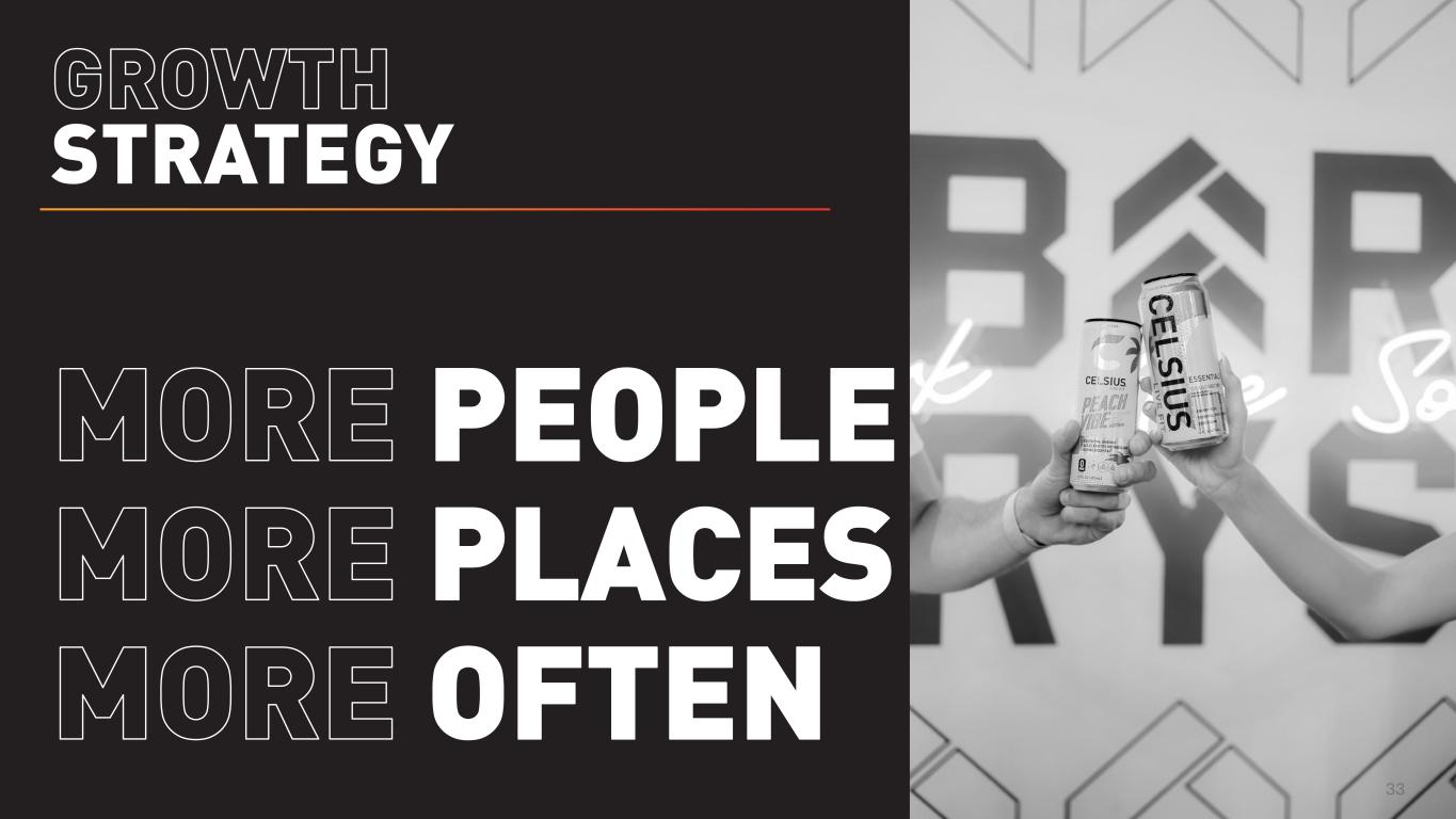DEMOGRAPHICS, EXPECTED TO DRIVE INCREMENTAL CATEGORY GROWTH TARGET AUDIENCE Gender-neutral, performance- driven with broad appeal to fitness enthusiasts and beyond Female-focused, lifestyle-oriented for consumers seeking a fun, approachable brand Functionality for athletes and fitness-focused individuals Centered around community, empowerment and wellness for young women Diverse portfolio of fruit-forward, refreshing flavors Bright, playful flavors BRAND POSITIONING FLAVOR INNOVATION Sleek, minimalist design with broad consumer appeal Vibrant, pastel color palette and feminine design AESTHETIC TARGET AUDIENCE BRAND POSITIONING FLAVOR INNOVATION AESTHETIC 32