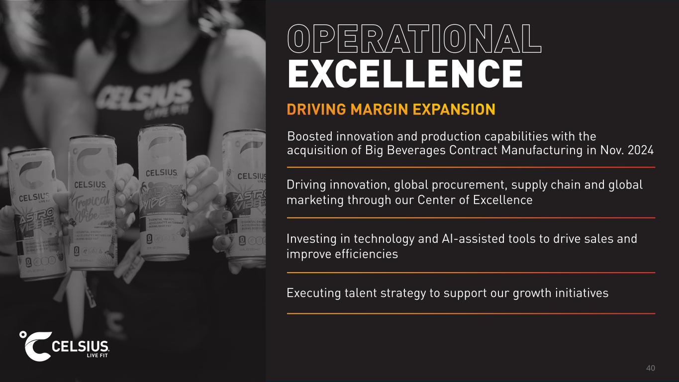 More People: Attracting new consumers into the energy drink category and converting existing energy users to Celsius More Places: Expanding product availability More Often: Increasing consumption frequency Driving EBITDA margin through operational excellence initiatives, designed to deliver strong cash flow generation IS DRIVING SHAREHOLDER VALUE 39