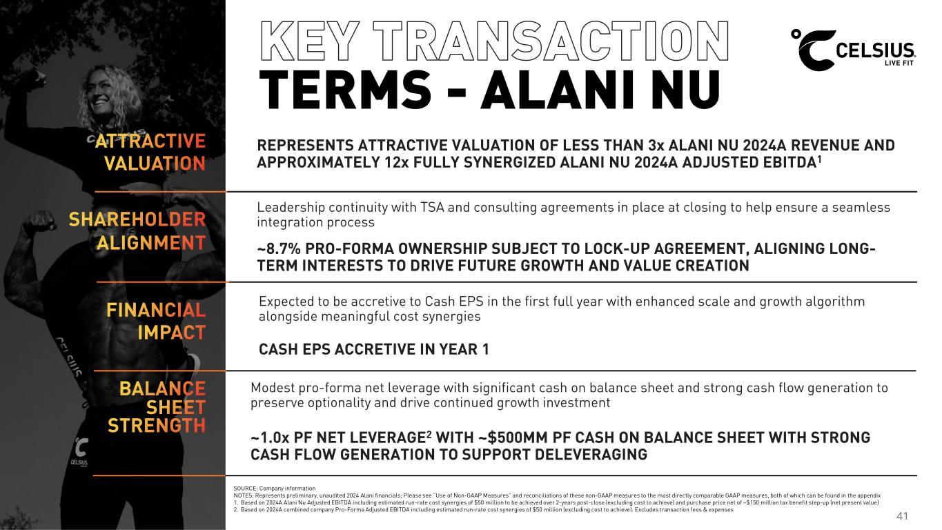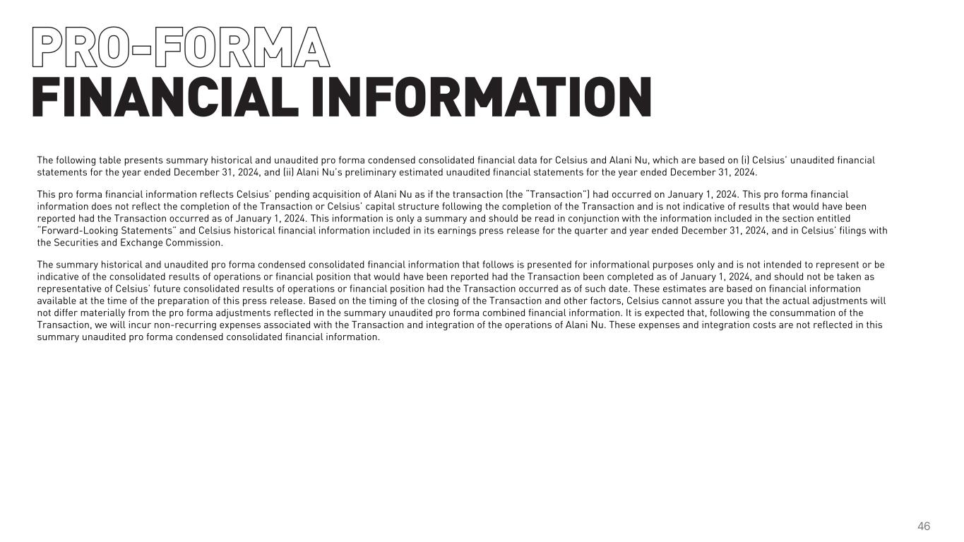 FINANCIAL INFORMATION 46 The following table presents summary historical and unaudited pro forma condensed consolidated financial data for Celsius and Alani Nu, which are based on (i) Celsius’ unaudited financial statements for the year ended December 31, 2024, and (ii) Alani Nu’s preliminary estimated unaudited financial statements for the year ended December 31, 2024. This pro forma financial information reflects Celsius’ pending acquisition of Alani Nu as if the transaction (the “Transaction”) had occurred on January 1, 2024. This pro forma financial information does not reflect the completion of the Transaction or Celsius’ capital structure following the completion of the Transaction and is not indicative of results that would have been reported had the Transaction occurred as of January 1, 2024. This information is only a summary and should be read in conjunction with the information included in the section entitled “Forward-Looking Statements” and Celsius historical financial information included in its earnings press release for the quarter and year ended December 31, 2024, and in Celsius’ filings with the Securities and Exchange Commission. The summary historical and unaudited pro forma condensed consolidated financial information that follows is presented for informational purposes only and is not intended to represent or be indicative of the consolidated results of operations or financial position that would have been reported had the Transaction been completed as of January 1, 2024, and should not be taken as representative of Celsius’ future consolidated results of operations or financial position had the Transaction occurred as of such date. These estimates are based on financial information available at the time of the preparation of this press release. Based on the timing of the closing of the Transaction and other factors, Celsius cannot assure you that the actual adjustments will not differ materially from the pro forma adjustments reflected in the summary unaudited pro forma combined financial information. It is expected that, following the consummation of the Transaction, we will incur non-recurring expenses associated with the Transaction and integration of the operations of Alani Nu. These expenses and integration costs are not reflected in this summary unaudited pro forma condensed consolidated financial information.