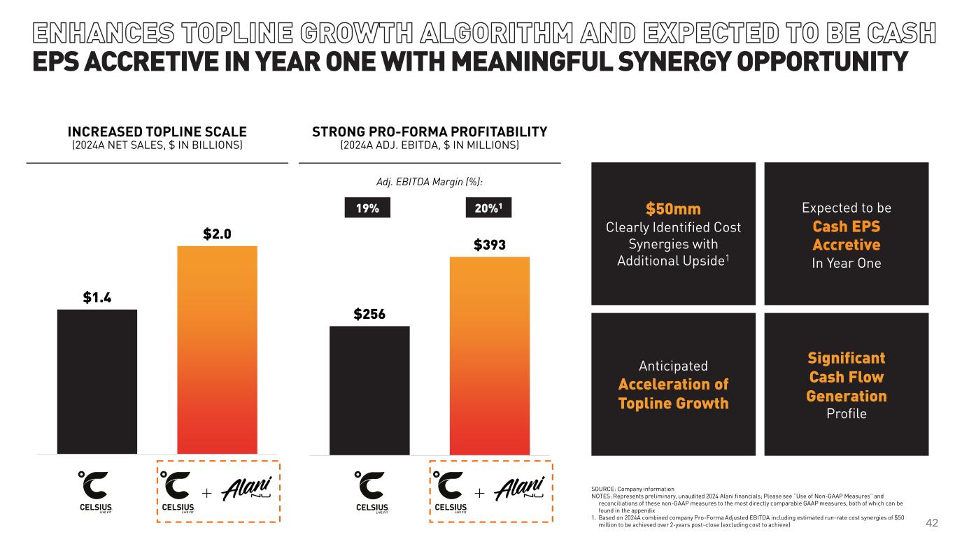 TERMS - ALANI NU REPRESENTS ATTRACTIVE VALUATION OF LESS THAN 3x ALANI NU 2024A REVENUE AND APPROXIMATELY 12x FULLY SYNERGIZED ALANI NU 2024A ADJUSTED EBITDA1 Leadership continuity with TSA and consulting agreements in place at closing to help ensure a seamless integration process ~8.7% PRO-FORMA OWNERSHIP SUBJECT TO LOCK-UP AGREEMENT, ALIGNING LONG- TERM INTERESTS TO DRIVE FUTURE GROWTH AND VALUE CREATION Modest pro-forma net leverage with significant cash on balance sheet and strong cash flow generation to preserve optionality and drive continued growth investment ~1.0x PF NET LEVERAGE2 WITH ~$500MM PF CASH ON BALANCE SHEET WITH STRONG CASH FLOW GENERATION TO SUPPORT DELEVERAGING 41 Expected to be accretive to Cash EPS in the first full year with enhanced scale and growth algorithm alongside meaningful cost synergies CASH EPS ACCRETIVE IN YEAR 1 SOURCE: Company information NOTES: Represents preliminary, unaudited 2024 Alani financials; Please see “Use of Non-GAAP Measures” and reconciliations of these non-GAAP measures to the most directly comparable GAAP measures, both of which can be found in the appendix 1. Based on 2024A Alani Nu Adjusted EBITDA including estimated run-rate cost synergies of $50 million to be achieved over 2-years post-close (excluding cost to achieve) and purchase price net of ~$150 million tax benefit step-up (net present value)​ 2. Based on 2024A combined company Pro-Forma Adjusted EBITDA including estimated run-rate cost synergies of $50 million (excluding cost to achieve). Excludes transaction fees & expenses
