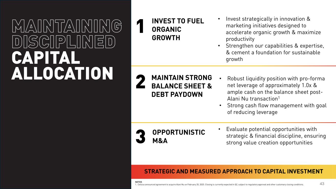 OPPORTUNISTIC M&A • Invest strategically in innovation & marketing initiatives designed to accelerate organic growth & maximize productivity • Strengthen our capabilities & expertise, & cement a foundation for sustainable growth MAINTAIN STRONG BALANCE SHEET & DEBT PAYDOWN • Evaluate potential opportunities with strategic & financial discipline, ensuring strong value creation opportunities • Robust liquidity position with pro-forma net leverage of approximately 1.0x & ample cash on the balance sheet post- Alani Nu transaction1 • Strong cash flow management with goal of reducing leverage 1 2 3 INVEST TO FUEL ORGANIC GROWTH CAPITAL ALLOCATION STRATEGIC AND MEASURED APPROACH TO CAPITAL INVESTMENT NOTES 1. Celsius announced agreement to acquire Alani Nu on February 20, 2025. Closing is currently expected in Q2, subject to regulatory approval and other customary closing conditions. 43