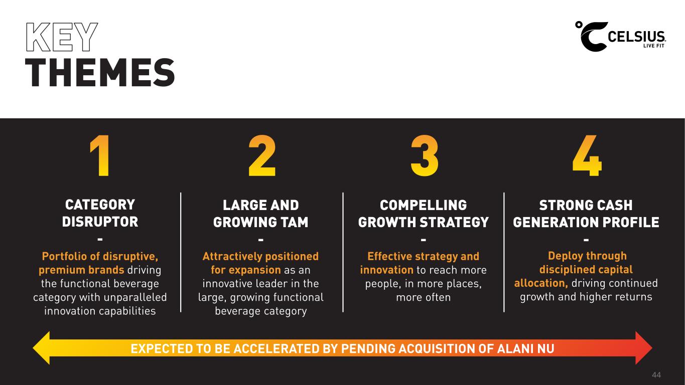 THEMES LARGE AND GROWING TAM - CATEGORY DISRUPTOR - COMPELLING GROWTH STRATEGY - Portfolio of disruptive, premium brands driving the functional beverage category with unparalleled innovation capabilities Effective strategy and innovation to reach more people, in more places, more often Attractively positioned for expansion as an innovative leader in the large, growing functional beverage category Deploy through disciplined capital allocation, driving continued growth and higher returns EXPECTED TO BE ACCELERATED BY PENDING ACQUISITION OF ALANI NU STRONG CASH GENERATION PROFILE - 44