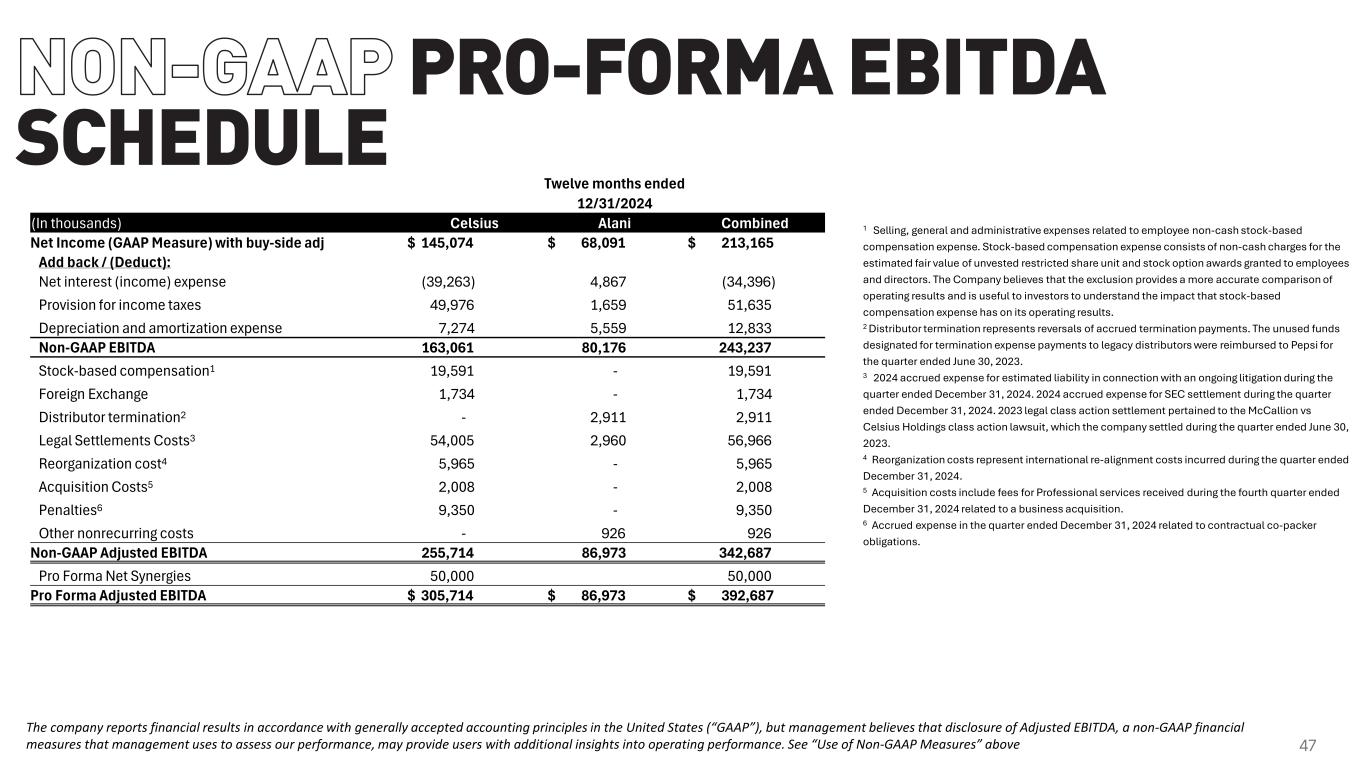 PRO-FORMA EBITDA SCHEDULE 1 Selling, general and administrative expenses related to employee non-cash stock-based compensation expense. Stock-based compensation expense consists of non-cash charges for the estimated fair value of unvested restricted share unit and stock option awards granted to employees and directors. The Company believes that the exclusion provides a more accurate comparison of operating results and is useful to investors to understand the impact that stock-based compensation expense has on its operating results. 2 Distributor termination represents reversals of accrued termination payments. The unused funds designated for termination expense payments to legacy distributors were reimbursed to Pepsi for the quarter ended June 30, 2023. 3 2024 accrued expense for estimated liability in connection with an ongoing litigation during the quarter ended December 31, 2024. 2024 accrued expense for SEC settlement during the quarter ended December 31, 2024. 2023 legal class action settlement pertained to the McCallion vs Celsius Holdings class action lawsuit, which the company settled during the quarter ended June 30, 2023. 4 Reorganization costs represent international re-alignment costs incurred during the quarter ended December 31, 2024. 5 Acquisition costs include fees for Professional services received during the fourth quarter ended December 31, 2024 related to a business acquisition. 6 Accrued expense in the quarter ended December 31, 2024 related to contractual co-packer obligations. The company reports financial results in accordance with generally accepted accounting principles in the United States (“GAAP”), but management believes that disclosure of Adjusted EBITDA, a non-GAAP financial measures that management uses to assess our performance, may provide users with additional insights into operating performance. See “Use of Non-GAAP Measures” above Twelve months ended 12/31/2024 (In thousands) Celsius Alani Combined Net Income (GAAP Measure) with buy-side adj $ 145,074 $ 68,091 $ 213,165 Add back / (Deduct): Net interest (income) expense (39,263) 4,867 (34,396) Provision for income taxes 49,976 1,659 51,635 Depreciation and amortization expense 7,274 5,559 12,833 Non-GAAP EBITDA 163,061 80,176 243,237 Stock-based compensation1 19,591 - 19,591 Foreign Exchange 1,734 - 1,734 Distributor termination2 - 2,911 2,911 Legal Settlements Costs3 54,005 2,960 56,966 Reorganization cost4 5,965 - 5,965 Acquisition Costs5 2,008 - 2,008 Penalties6 9,350 - 9,350 Other nonrecurring costs - 926 926 Non-GAAP Adjusted EBITDA 255,714 86,973 342,687 Pro Forma Net Synergies 50,000 50,000 Pro Forma Adjusted EBITDA $ 305,714 $ 86,973 $ 392,687 47
