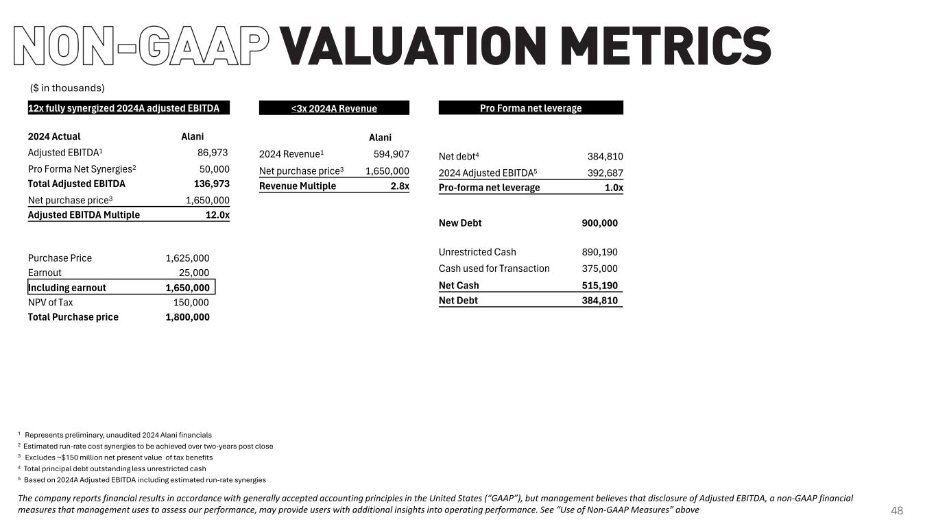 VALUATION METRICS The company reports financial results in accordance with generally accepted accounting principles in the United States (“GAAP”), but management believes that disclosure of Adjusted EBITDA, a non-GAAP financial measures that management uses to assess our performance, may provide users with additional insights into operating performance. See “Use of Non-GAAP Measures” above 12x fully synergized 2024A adjusted EBITDA 2024 Actual Alani Adjusted EBITDA1 86,973 Pro Forma Net Synergies2 50,000 Total Adjusted EBITDA 136,973 Net purchase price3 1,650,000 Adjusted EBITDA Multiple 12.0x 1 Represents preliminary, unaudited 2024 Alani financials 2 Estimated run-rate cost synergies to be achieved over two-years post close 3 Excludes ~$150 million net present value of tax benefits 4 Total principal debt outstanding less unrestricted cash 5 Based on 2024A Adjusted EBITDA including estimated run-rate synergies Purchase Price 1,625,000 Earnout 25,000 Including earnout 1,650,000 NPV of Tax 150,000 Total Purchase price 1,800,000 <3x 2024A Revenue Alani 2024 Revenue1 594,907 Net purchase price3 1,650,000 Revenue Multiple 2.8x Pro Forma net leverage Net debt4 384,810 2024 Adjusted EBITDA5 392,687 Pro-forma net leverage 1.0x New Debt 900,000 Unrestricted Cash 890,190 Cash used for Transaction 375,000 Net Cash 515,190 Net Debt 384,810 48 ($ in thousands)