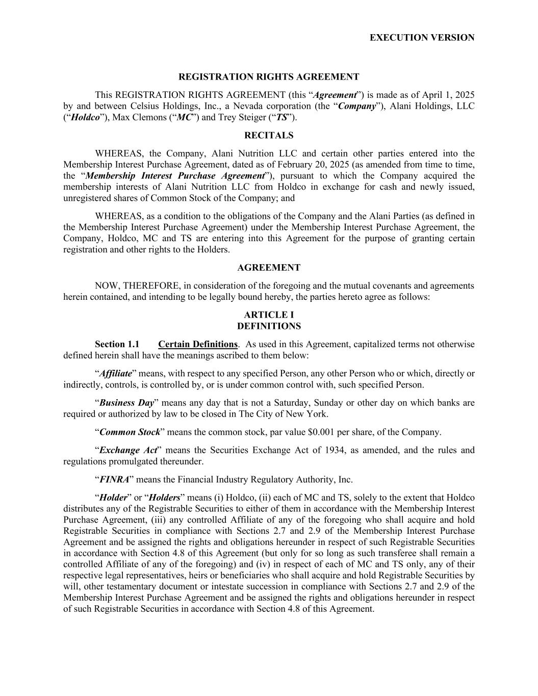 EXECUTION VERSION REGISTRATION RIGHTS AGREEMENT This REGISTRATION RIGHTS AGREEMENT (this “Agreement”) is made as of April 1, 2025 by and between Celsius Holdings, Inc., a Nevada corporation (the “Company”), Alani Holdings, LLC (“Holdco”), Max Clemons (“MC”) and Trey Steiger (“TS”). RECITALS WHEREAS, the Company, Alani Nutrition LLC and certain other parties entered into the Membership Interest Purchase Agreement, dated as of February 20, 2025 (as amended from time to time, the “Membership Interest Purchase Agreement”), pursuant to which the Company acquired the membership interests of Alani Nutrition LLC from Holdco in exchange for cash and newly issued, unregistered shares of Common Stock of the Company; and WHEREAS, as a condition to the obligations of the Company and the Alani Parties (as defined in the Membership Interest Purchase Agreement) under the Membership Interest Purchase Agreement, the Company, Holdco, MC and TS are entering into this Agreement for the purpose of granting certain registration and other rights to the Holders. AGREEMENT NOW, THEREFORE, in consideration of the foregoing and the mutual covenants and agreements herein contained, and intending to be legally bound hereby, the parties hereto agree as follows: ARTICLE I DEFINITIONS Section 1.1 Certain Definitions. As used in this Agreement, capitalized terms not otherwise defined herein shall have the meanings ascribed to them below: “Affiliate” means, with respect to any specified Person, any other Person who or which, directly or indirectly, controls, is controlled by, or is under common control with, such specified Person. “Business Day” means any day that is not a Saturday, Sunday or other day on which banks are required or authorized by law to be closed in The City of New York. “Common Stock” means the common stock, par value $0.001 per share, of the Company. “Exchange Act” means the Securities Exchange Act of 1934, as amended, and the rules and regulations promulgated thereunder. “FINRA” means the Financial Industry Regulatory Authority, Inc. “Holder” or “Holders” means (i) Holdco, (ii) each of MC and TS, solely to the extent that Holdco distributes any of the Registrable Securities to either of them in accordance with the Membership Interest Purchase Agreement, (iii) any controlled Affiliate of any of the foregoing who shall acquire and hold Registrable Securities in compliance with Sections 2.7 and 2.9 of the Membership Interest Purchase Agreement and be assigned the rights and obligations hereunder in respect of such Registrable Securities in accordance with Section 4.8 of this Agreement (but only for so long as such transferee shall remain a controlled Affiliate of any of the foregoing) and (iv) in respect of each of MC and TS only, any of their respective legal representatives, heirs or beneficiaries who shall acquire and hold Registrable Securities by will, other testamentary document or intestate succession in compliance with Sections 2.7 and 2.9 of the Membership Interest Purchase Agreement and be assigned the rights and obligations hereunder in respect of such Registrable Securities in accordance with Section 4.8 of this Agreement.