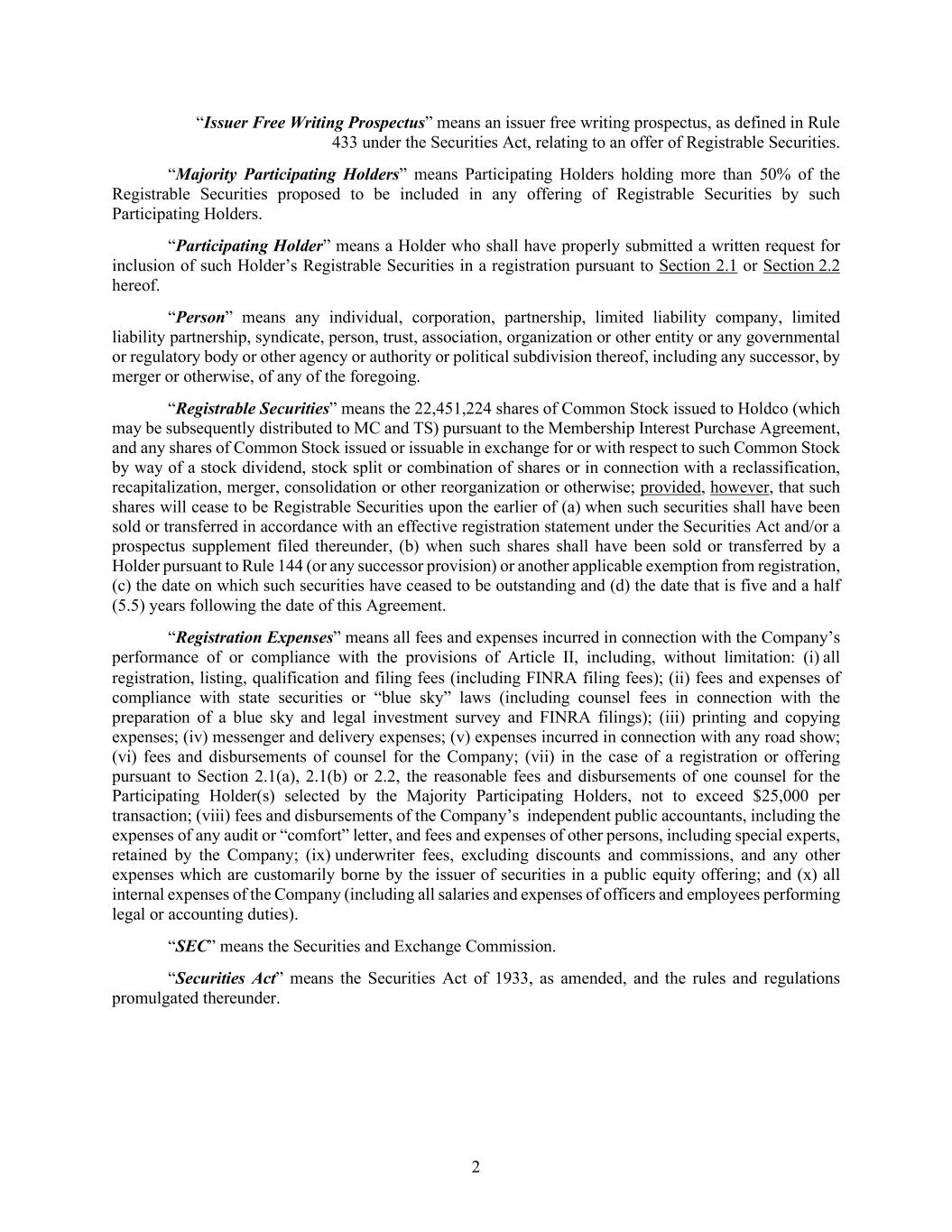 2 “Issuer Free Writing Prospectus” means an issuer free writing prospectus, as defined in Rule 433 under the Securities Act, relating to an offer of Registrable Securities. “Majority Participating Holders” means Participating Holders holding more than 50% of the Registrable Securities proposed to be included in any offering of Registrable Securities by such Participating Holders. “Participating Holder” means a Holder who shall have properly submitted a written request for inclusion of such Holder’s Registrable Securities in a registration pursuant to Section 2.1 or Section 2.2 hereof. “Person” means any individual, corporation, partnership, limited liability company, limited liability partnership, syndicate, person, trust, association, organization or other entity or any governmental or regulatory body or other agency or authority or political subdivision thereof, including any successor, by merger or otherwise, of any of the foregoing. “Registrable Securities” means the 22,451,224 shares of Common Stock issued to Holdco (which may be subsequently distributed to MC and TS) pursuant to the Membership Interest Purchase Agreement, and any shares of Common Stock issued or issuable in exchange for or with respect to such Common Stock by way of a stock dividend, stock split or combination of shares or in connection with a reclassification, recapitalization, merger, consolidation or other reorganization or otherwise; provided, however, that such shares will cease to be Registrable Securities upon the earlier of (a) when such securities shall have been sold or transferred in accordance with an effective registration statement under the Securities Act and/or a prospectus supplement filed thereunder, (b) when such shares shall have been sold or transferred by a Holder pursuant to Rule 144 (or any successor provision) or another applicable exemption from registration, (c) the date on which such securities have ceased to be outstanding and (d) the date that is five and a half (5.5) years following the date of this Agreement. “Registration Expenses” means all fees and expenses incurred in connection with the Company’s performance of or compliance with the provisions of Article II, including, without limitation: (i) all registration, listing, qualification and filing fees (including FINRA filing fees); (ii) fees and expenses of compliance with state securities or “blue sky” laws (including counsel fees in connection with the preparation of a blue sky and legal investment survey and FINRA filings); (iii) printing and copying expenses; (iv) messenger and delivery expenses; (v) expenses incurred in connection with any road show; (vi) fees and disbursements of counsel for the Company; (vii) in the case of a registration or offering pursuant to Section 2.1(a), 2.1(b) or 2.2, the reasonable fees and disbursements of one counsel for the Participating Holder(s) selected by the Majority Participating Holders, not to exceed $25,000 per transaction; (viii) fees and disbursements of the Company’s independent public accountants, including the expenses of any audit or “comfort” letter, and fees and expenses of other persons, including special experts, retained by the Company; (ix) underwriter fees, excluding discounts and commissions, and any other expenses which are customarily borne by the issuer of securities in a public equity offering; and (x) all internal expenses of the Company (including all salaries and expenses of officers and employees performing legal or accounting duties). “SEC” means the Securities and Exchange Commission. “Securities Act” means the Securities Act of 1933, as amended, and the rules and regulations promulgated thereunder.
