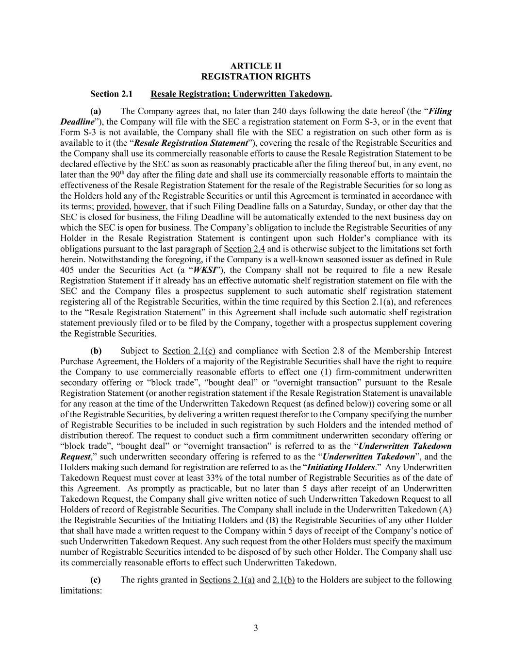 3 ARTICLE II REGISTRATION RIGHTS Section 2.1 Resale Registration; Underwritten Takedown. (a) The Company agrees that, no later than 240 days following the date hereof (the “Filing Deadline”), the Company will file with the SEC a registration statement on Form S-3, or in the event that Form S-3 is not available, the Company shall file with the SEC a registration on such other form as is available to it (the “Resale Registration Statement”), covering the resale of the Registrable Securities and the Company shall use its commercially reasonable efforts to cause the Resale Registration Statement to be declared effective by the SEC as soon as reasonably practicable after the filing thereof but, in any event, no later than the 90th day after the filing date and shall use its commercially reasonable efforts to maintain the effectiveness of the Resale Registration Statement for the resale of the Registrable Securities for so long as the Holders hold any of the Registrable Securities or until this Agreement is terminated in accordance with its terms; provided, however, that if such Filing Deadline falls on a Saturday, Sunday, or other day that the SEC is closed for business, the Filing Deadline will be automatically extended to the next business day on which the SEC is open for business. The Company’s obligation to include the Registrable Securities of any Holder in the Resale Registration Statement is contingent upon such Holder’s compliance with its obligations pursuant to the last paragraph of Section 2.4 and is otherwise subject to the limitations set forth herein. Notwithstanding the foregoing, if the Company is a well-known seasoned issuer as defined in Rule 405 under the Securities Act (a “WKSI”), the Company shall not be required to file a new Resale Registration Statement if it already has an effective automatic shelf registration statement on file with the SEC and the Company files a prospectus supplement to such automatic shelf registration statement registering all of the Registrable Securities, within the time required by this Section 2.1(a), and references to the “Resale Registration Statement” in this Agreement shall include such automatic shelf registration statement previously filed or to be filed by the Company, together with a prospectus supplement covering the Registrable Securities. (b) Subject to Section 2.1(c) and compliance with Section 2.8 of the Membership Interest Purchase Agreement, the Holders of a majority of the Registrable Securities shall have the right to require the Company to use commercially reasonable efforts to effect one (1) firm-commitment underwritten secondary offering or “block trade”, “bought deal” or “overnight transaction” pursuant to the Resale Registration Statement (or another registration statement if the Resale Registration Statement is unavailable for any reason at the time of the Underwritten Takedown Request (as defined below)) covering some or all of the Registrable Securities, by delivering a written request therefor to the Company specifying the number of Registrable Securities to be included in such registration by such Holders and the intended method of distribution thereof. The request to conduct such a firm commitment underwritten secondary offering or “block trade”, “bought deal” or “overnight transaction” is referred to as the “Underwritten Takedown Request,” such underwritten secondary offering is referred to as the “Underwritten Takedown”, and the Holders making such demand for registration are referred to as the “Initiating Holders.” Any Underwritten Takedown Request must cover at least 33% of the total number of Registrable Securities as of the date of this Agreement. As promptly as practicable, but no later than 5 days after receipt of an Underwritten Takedown Request, the Company shall give written notice of such Underwritten Takedown Request to all Holders of record of Registrable Securities. The Company shall include in the Underwritten Takedown (A) the Registrable Securities of the Initiating Holders and (B) the Registrable Securities of any other Holder that shall have made a written request to the Company within 5 days of receipt of the Company’s notice of such Underwritten Takedown Request. Any such request from the other Holders must specify the maximum number of Registrable Securities intended to be disposed of by such other Holder. The Company shall use its commercially reasonable efforts to effect such Underwritten Takedown. (c) The rights granted in Sections 2.1(a) and 2.1(b) to the Holders are subject to the following limitations: