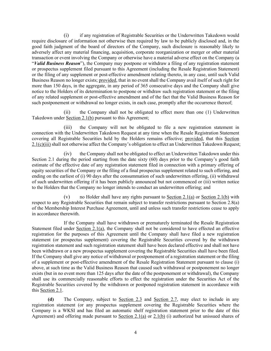 4 (i) if any registration of Registrable Securities or the Underwritten Takedown would require disclosure of information not otherwise then required by law to be publicly disclosed and, in the good faith judgment of the board of directors of the Company, such disclosure is reasonably likely to adversely affect any material financing, acquisition, corporate reorganization or merger or other material transaction or event involving the Company or otherwise have a material adverse effect on the Company (a “Valid Business Reason”), the Company may postpone or withdraw a filing of any registration statement or prospectus supplement filed pursuant to this Agreement (including the Resale Registration Statement) or the filing of any supplement or post-effective amendment relating thereto, in any case, until such Valid Business Reason no longer exists; provided, that in no event shall the Company avail itself of such right for more than 150 days, in the aggregate, in any period of 365 consecutive days and the Company shall give notice to the Holders of its determination to postpone or withdraw such registration statement or the filing of any related supplement or post-effective amendment and of the fact that the Valid Business Reason for such postponement or withdrawal no longer exists, in each case, promptly after the occurrence thereof; (ii) the Company shall not be obligated to effect more than one (1) Underwritten Takedown under Section 2.1(b) pursuant to this Agreement; (iii) the Company will not be obligated to file a new registration statement in connection with the Underwritten Takedown Request at any time when the Resale Registration Statement covering all Registrable Securities held by the Holders remains effective; provided, that this Section 2.1(c)(iii) shall not otherwise affect the Company’s obligation to effect an Underwritten Takedown Request; (iv) the Company shall not be obligated to effect an Underwritten Takedown under this Section 2.1 during the period starting from the date sixty (60) days prior to the Company’s good faith estimate of the effective date of any registration statement filed in connection with a primary offering of equity securities of the Company or the filing of a final prospectus supplement related to such offering, and ending on the earliest of (i) 90 days after the consummation of such underwritten offering, (ii) withdrawal of such underwritten offering if it has been publicly announced but not commenced or (iii) written notice to the Holders that the Company no longer intends to conduct an underwritten offering; and (v) no Holder shall have any rights pursuant to Section 2.1(a) or Section 2.1(b) with respect to any Registrable Securities that remain subject to transfer restrictions pursuant to Section 2.8(a) of the Membership Interest Purchase Agreement, until and unless such transfer restrictions cease to apply in accordance therewith. If the Company shall have withdrawn or prematurely terminated the Resale Registration Statement filed under Section 2.1(a), the Company shall not be considered to have effected an effective registration for the purposes of this Agreement until the Company shall have filed a new registration statement (or prospectus supplement) covering the Registrable Securities covered by the withdrawn registration statement and such registration statement shall have been declared effective and shall not have been withdrawn or a new prospectus supplement covering the Registrable Securities shall have been filed. If the Company shall give any notice of withdrawal or postponement of a registration statement or the filing of a supplement or post-effective amendment of the Resale Registration Statement pursuant to clause (i) above, at such time as the Valid Business Reason that caused such withdrawal or postponement no longer exists (but in no event more than 125 days after the date of the postponement or withdrawal), the Company shall use its commercially reasonable efforts to effect the registration under the Securities Act of the Registrable Securities covered by the withdrawn or postponed registration statement in accordance with this Section 2.1. (d) The Company, subject to Section 2.3 and Section 2.7, may elect to include in any registration statement (or any prospectus supplement covering the Registrable Securities where the Company is a WKSI and has filed an automatic shelf registration statement prior to the date of this Agreement) and offering made pursuant to Section 2.1(a) or 2.1(b) (i) authorized but unissued shares of