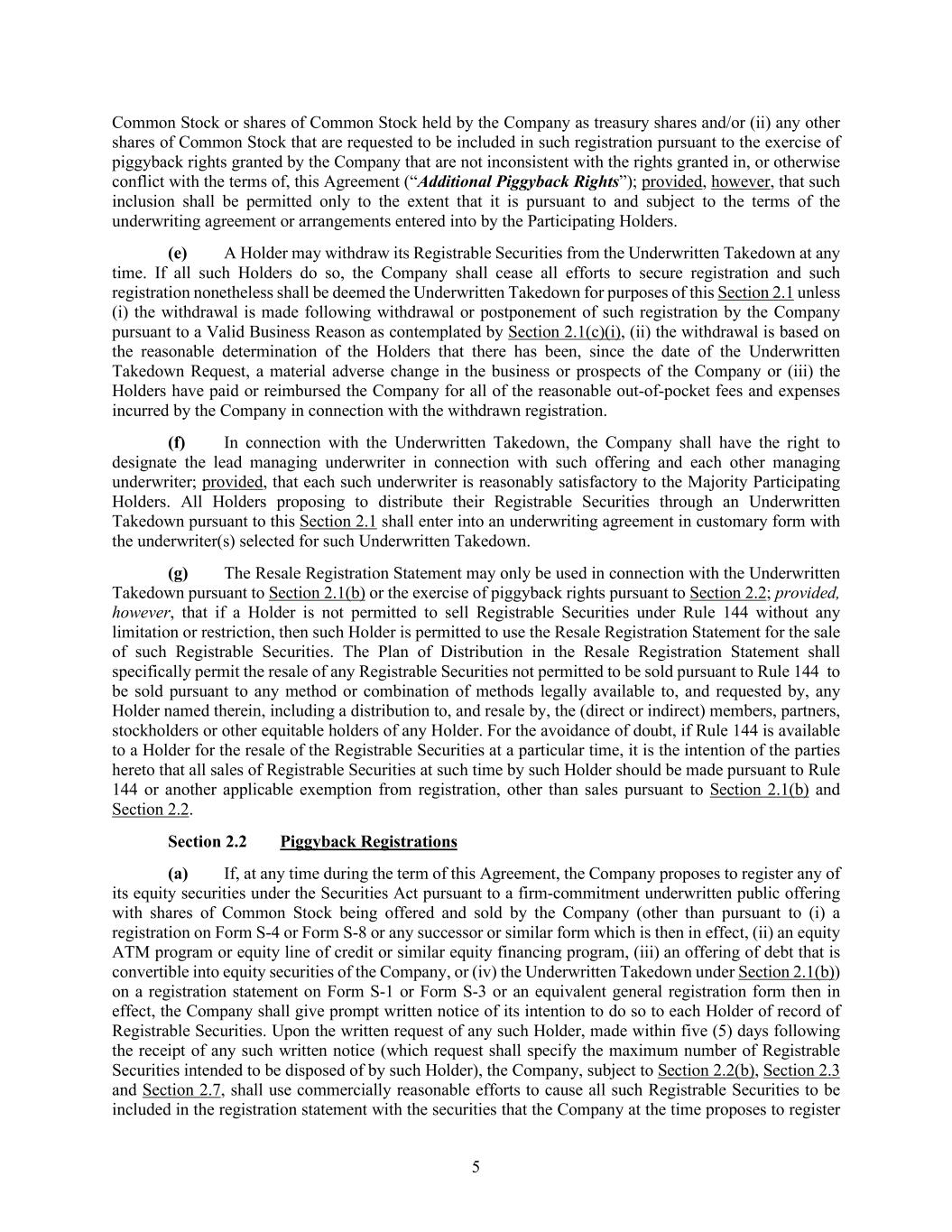 5 Common Stock or shares of Common Stock held by the Company as treasury shares and/or (ii) any other shares of Common Stock that are requested to be included in such registration pursuant to the exercise of piggyback rights granted by the Company that are not inconsistent with the rights granted in, or otherwise conflict with the terms of, this Agreement (“Additional Piggyback Rights”); provided, however, that such inclusion shall be permitted only to the extent that it is pursuant to and subject to the terms of the underwriting agreement or arrangements entered into by the Participating Holders. (e) A Holder may withdraw its Registrable Securities from the Underwritten Takedown at any time. If all such Holders do so, the Company shall cease all efforts to secure registration and such registration nonetheless shall be deemed the Underwritten Takedown for purposes of this Section 2.1 unless (i) the withdrawal is made following withdrawal or postponement of such registration by the Company pursuant to a Valid Business Reason as contemplated by Section 2.1(c)(i), (ii) the withdrawal is based on the reasonable determination of the Holders that there has been, since the date of the Underwritten Takedown Request, a material adverse change in the business or prospects of the Company or (iii) the Holders have paid or reimbursed the Company for all of the reasonable out-of-pocket fees and expenses incurred by the Company in connection with the withdrawn registration. (f) In connection with the Underwritten Takedown, the Company shall have the right to designate the lead managing underwriter in connection with such offering and each other managing underwriter; provided, that each such underwriter is reasonably satisfactory to the Majority Participating Holders. All Holders proposing to distribute their Registrable Securities through an Underwritten Takedown pursuant to this Section 2.1 shall enter into an underwriting agreement in customary form with the underwriter(s) selected for such Underwritten Takedown. (g) The Resale Registration Statement may only be used in connection with the Underwritten Takedown pursuant to Section 2.1(b) or the exercise of piggyback rights pursuant to Section 2.2; provided, however, that if a Holder is not permitted to sell Registrable Securities under Rule 144 without any limitation or restriction, then such Holder is permitted to use the Resale Registration Statement for the sale of such Registrable Securities. The Plan of Distribution in the Resale Registration Statement shall specifically permit the resale of any Registrable Securities not permitted to be sold pursuant to Rule 144 to be sold pursuant to any method or combination of methods legally available to, and requested by, any Holder named therein, including a distribution to, and resale by, the (direct or indirect) members, partners, stockholders or other equitable holders of any Holder. For the avoidance of doubt, if Rule 144 is available to a Holder for the resale of the Registrable Securities at a particular time, it is the intention of the parties hereto that all sales of Registrable Securities at such time by such Holder should be made pursuant to Rule 144 or another applicable exemption from registration, other than sales pursuant to Section 2.1(b) and Section 2.2. Section 2.2 Piggyback Registrations (a) If, at any time during the term of this Agreement, the Company proposes to register any of its equity securities under the Securities Act pursuant to a firm-commitment underwritten public offering with shares of Common Stock being offered and sold by the Company (other than pursuant to (i) a registration on Form S-4 or Form S-8 or any successor or similar form which is then in effect, (ii) an equity ATM program or equity line of credit or similar equity financing program, (iii) an offering of debt that is convertible into equity securities of the Company, or (iv) the Underwritten Takedown under Section 2.1(b)) on a registration statement on Form S-1 or Form S-3 or an equivalent general registration form then in effect, the Company shall give prompt written notice of its intention to do so to each Holder of record of Registrable Securities. Upon the written request of any such Holder, made within five (5) days following the receipt of any such written notice (which request shall specify the maximum number of Registrable Securities intended to be disposed of by such Holder), the Company, subject to Section 2.2(b), Section 2.3 and Section 2.7, shall use commercially reasonable efforts to cause all such Registrable Securities to be included in the registration statement with the securities that the Company at the time proposes to register