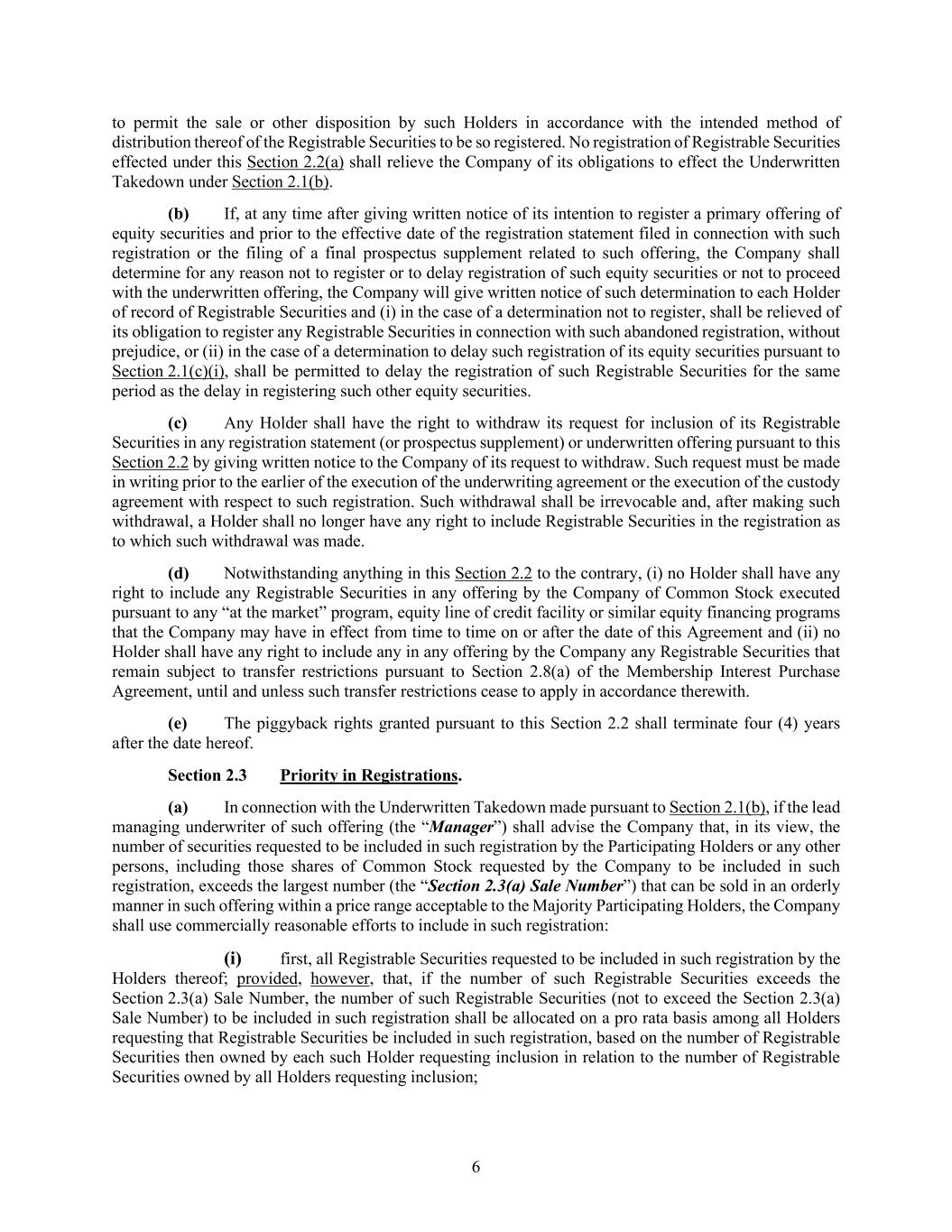 6 to permit the sale or other disposition by such Holders in accordance with the intended method of distribution thereof of the Registrable Securities to be so registered. No registration of Registrable Securities effected under this Section 2.2(a) shall relieve the Company of its obligations to effect the Underwritten Takedown under Section 2.1(b). (b) If, at any time after giving written notice of its intention to register a primary offering of equity securities and prior to the effective date of the registration statement filed in connection with such registration or the filing of a final prospectus supplement related to such offering, the Company shall determine for any reason not to register or to delay registration of such equity securities or not to proceed with the underwritten offering, the Company will give written notice of such determination to each Holder of record of Registrable Securities and (i) in the case of a determination not to register, shall be relieved of its obligation to register any Registrable Securities in connection with such abandoned registration, without prejudice, or (ii) in the case of a determination to delay such registration of its equity securities pursuant to Section 2.1(c)(i), shall be permitted to delay the registration of such Registrable Securities for the same period as the delay in registering such other equity securities. (c) Any Holder shall have the right to withdraw its request for inclusion of its Registrable Securities in any registration statement (or prospectus supplement) or underwritten offering pursuant to this Section 2.2 by giving written notice to the Company of its request to withdraw. Such request must be made in writing prior to the earlier of the execution of the underwriting agreement or the execution of the custody agreement with respect to such registration. Such withdrawal shall be irrevocable and, after making such withdrawal, a Holder shall no longer have any right to include Registrable Securities in the registration as to which such withdrawal was made. (d) Notwithstanding anything in this Section 2.2 to the contrary, (i) no Holder shall have any right to include any Registrable Securities in any offering by the Company of Common Stock executed pursuant to any “at the market” program, equity line of credit facility or similar equity financing programs that the Company may have in effect from time to time on or after the date of this Agreement and (ii) no Holder shall have any right to include any in any offering by the Company any Registrable Securities that remain subject to transfer restrictions pursuant to Section 2.8(a) of the Membership Interest Purchase Agreement, until and unless such transfer restrictions cease to apply in accordance therewith. (e) The piggyback rights granted pursuant to this Section 2.2 shall terminate four (4) years after the date hereof. Section 2.3 Priority in Registrations. (a) In connection with the Underwritten Takedown made pursuant to Section 2.1(b), if the lead managing underwriter of such offering (the “Manager”) shall advise the Company that, in its view, the number of securities requested to be included in such registration by the Participating Holders or any other persons, including those shares of Common Stock requested by the Company to be included in such registration, exceeds the largest number (the “Section 2.3(a) Sale Number”) that can be sold in an orderly manner in such offering within a price range acceptable to the Majority Participating Holders, the Company shall use commercially reasonable efforts to include in such registration: (i) first, all Registrable Securities requested to be included in such registration by the Holders thereof; provided, however, that, if the number of such Registrable Securities exceeds the Section 2.3(a) Sale Number, the number of such Registrable Securities (not to exceed the Section 2.3(a) Sale Number) to be included in such registration shall be allocated on a pro rata basis among all Holders requesting that Registrable Securities be included in such registration, based on the number of Registrable Securities then owned by each such Holder requesting inclusion in relation to the number of Registrable Securities owned by all Holders requesting inclusion;